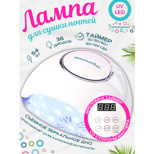 Лампа для маникюра Аэропуфинг для сушки ногтей с технологией двойного источника излучения UV/LED мощностью 54 Вт обеспечивает мгновенную полимеризацию гель-лаков, биогелей и других гель-лаковых покрытий. Обладает двойной функциональностью, сочетая в себе два вида излучения УФ и Лед в отличие от только ультрафиолетовой маникюрной лампы или led лампы сушки ногтей. led лампа для ногтей имеет удобный и эргономичный дизайн. Светодиоды расположены таким образом, что позволяет сушить покрытия одновременно на всех пяти пальцах, обеспечивая быструю и равномерную полимеризацию. Излучение лампы не оказывает вредного воздействия на кожу рук и глаза. Яркость светодиодов остается постоянной на протяжении длительного времени использования - до 50 000 часов. Профессиональная лампа для маникюра F4Plus оснащена сенсорным управлением и таймером на 10, 30, 60, 90 и 120 секунд с опцией Low Heat Mode-режим на кнопке таймера 120S для постепенного повышения мощности излучения и комфортного высыхания гелевых покрытий без чувства жжения. Дополнительно, uv лампа имеет съемное дно на магнитах для удобства работы с педикюром. Технические характеристики гибридной лампы включают в себя: мощность 54 Вт; 36 светодиодов; длина волн 365 nm + 405 nm; датчик движения; LED Digital дисплей; таймер 10, 30, 60, 90, 120 секунд; режим постепенного нагрева Low Heat Mode; размер: 203*200*110 мм; съемное дно: есть; гарантия: 6 месяцев; производство: Китай. Лампа выполнена в цветах: белый, розовый и черный. LED лампа для маникюра профессиональная мощная является неотъемлемым атрибутом для любого мастера маникюра, обеспечивая идеальный результат с минимальными затратами времени и усилий. Работа с этой стильной и функциональной лампой будет в удовольствие, а клиенты останутся довольными.