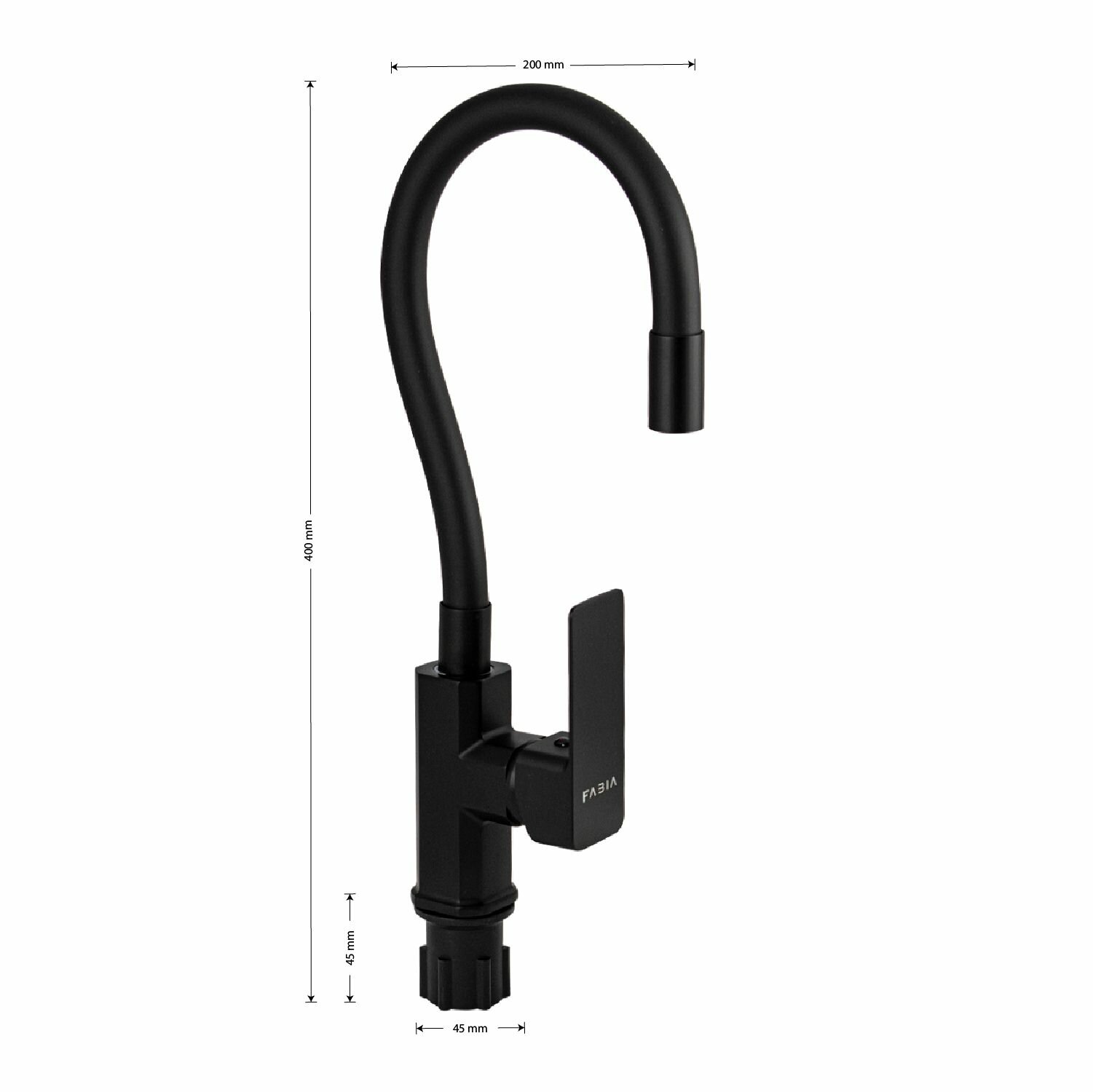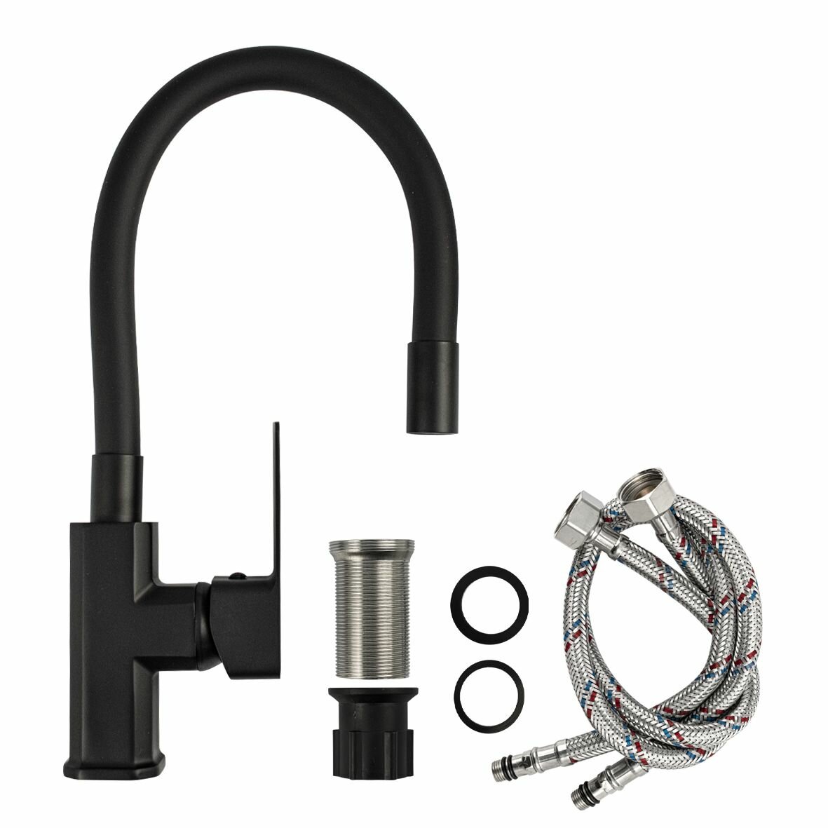 Смеситель для кухонной мойки и раковин, хромированный, боковой, шаровый d = мм, массивный корпус с гибким изливом чёрного цвета, с аэратором для экономии воды. Материал изготовления — ЦАМ (цинк-алюминий-медь). Крепление резьба - гайка, литая ручка. Габаритные размеры: высота мм, длина мм, диаметр посадочного седла мм, длина резьбы мм, длина подводки мм. Вес — 1,5 кг, объём - м3. В комплекте корпус с изливом, паспорт, подводка 1/2, крепёж. Габаритные размеры коробки: ширина 200 мм, высота 400 мм, высота резьбы 45 мм, диаметр посадочного седла 45 мм.