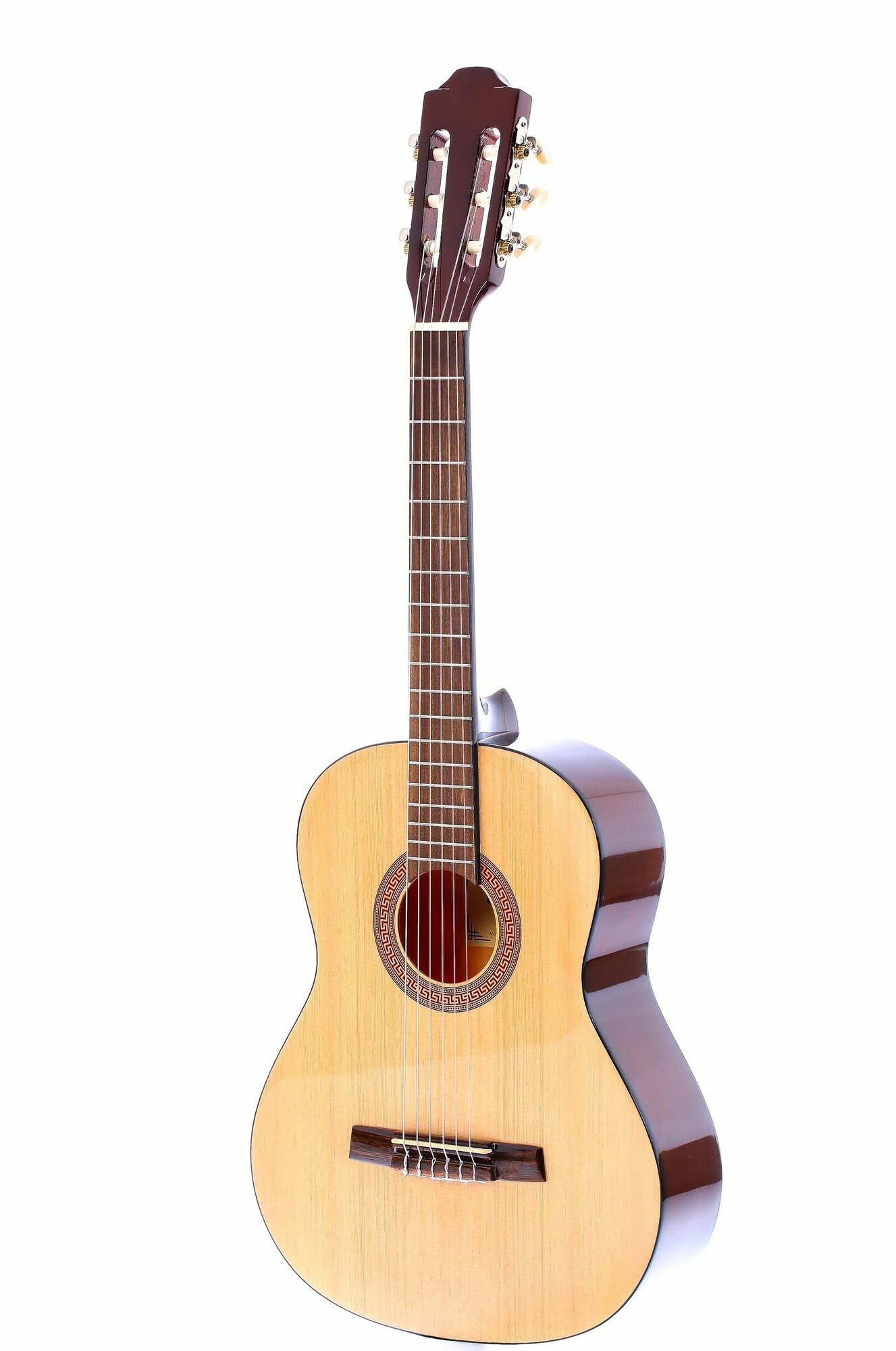 Детская классическая гитара Fabio FC03 размер 36" дюймов (3/4), 6 нейлоновых струн, 19 ладов. Материал корпуса выполнен из качественной древесины(ель), отделка инструмента-гланцевый лак бежевого цвета. Идеально подходит для детей 9-12 лет.