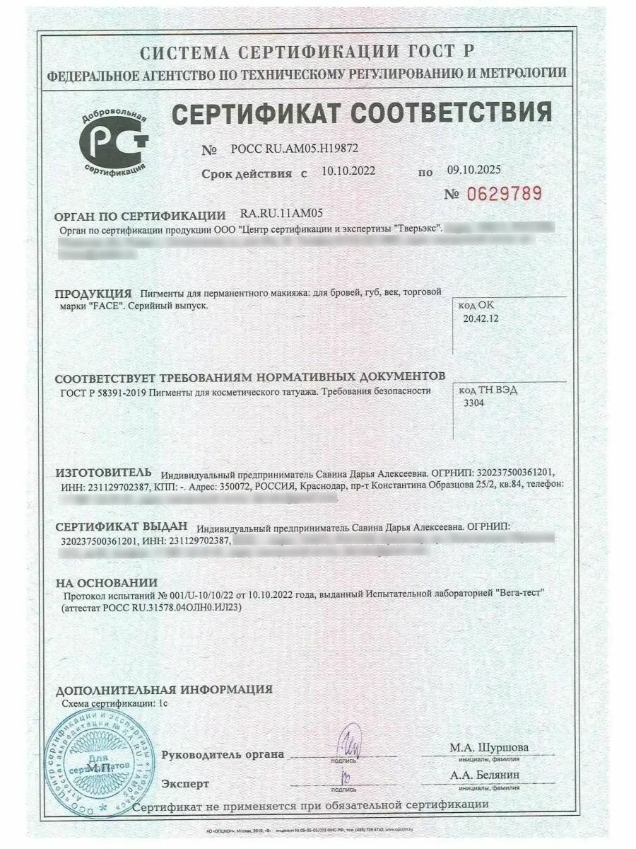 Пигменты FACE - это сертифицированный продукт, который соответствует всем требованиям безопасности ГОСТ и имеет необходимые документы и декларации.