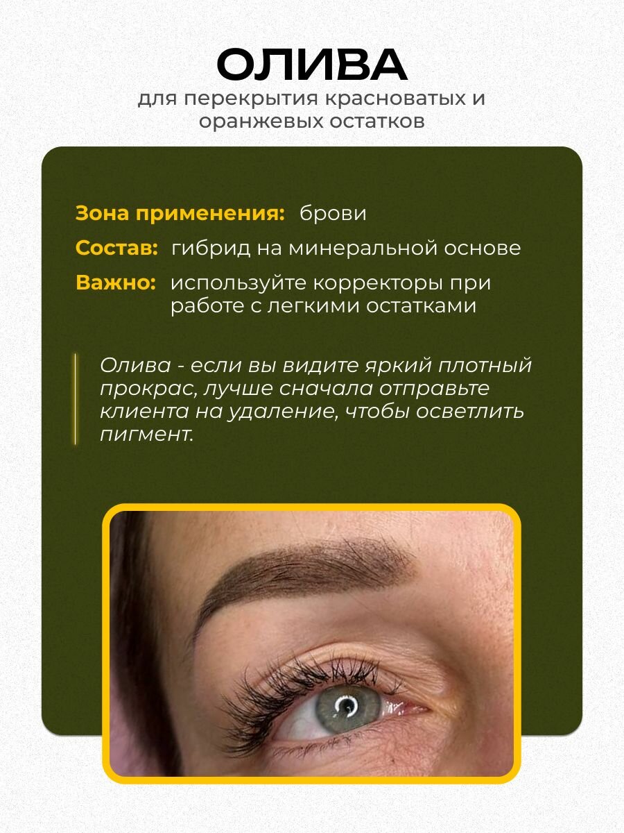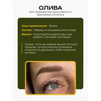 Олива - корректор на зелёной основе. Подходит для цветокоррекции нежелательного оттенка татуажа, имеющего характерно розово-красный цвет. В зависимости от насыщенности цвета, работать следует поэтапно, лёгкими касательными движениями, не плотно.