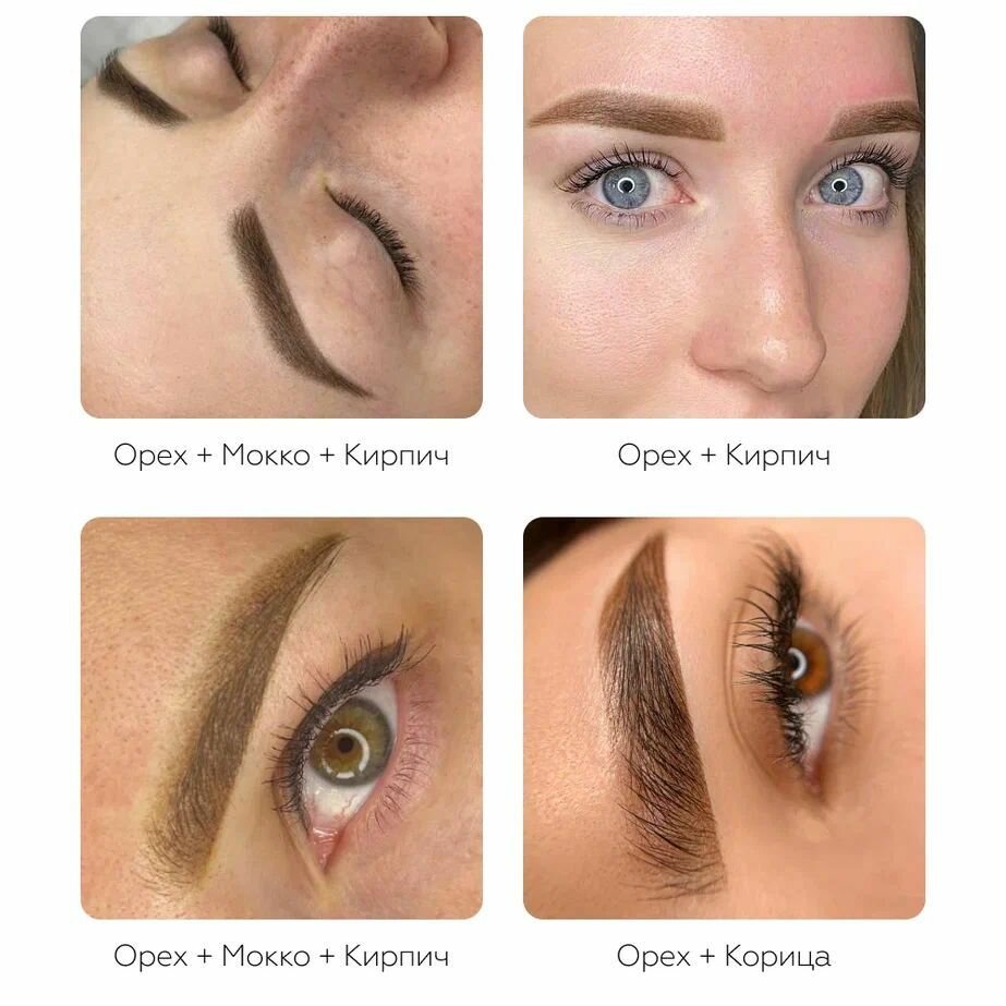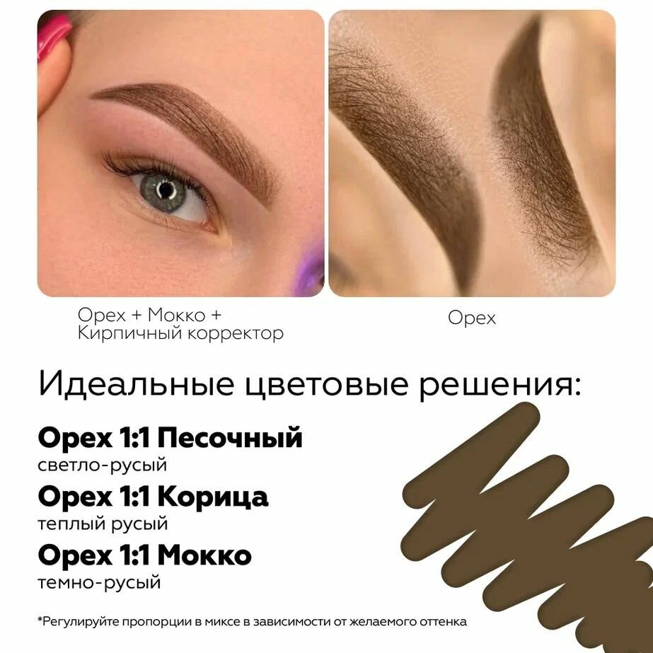 Орех универсальный оттенок, подходящий большинству девушек. Нейтрально-коричневый, на зеленой основе с добавлением желтого и красного. При заживлении получится красивый мягкий коричнево-русый оттенок. Оттенок универсальный и как BB-крем подстраивается под кожу. На теплой коже он будет чуть теплее, на холодной чуть холоднее.