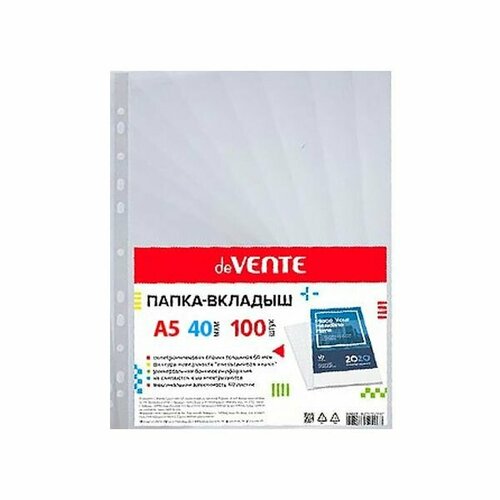 Папка-вкладыш deVENTE A5 вертикальная 40 мкм, гладкая фактура, без перфорации, 100 штук в упаковке. Перфорированные папки-файлы формата А5 предназначены для хранения документов и подходят для подшивки в папки с любым кольцевым механизмом и скоросшивателем. Папка-файл имеет внутренние размеры 160x211 мм и вертикальную ориентацию, вход по узкой стороне. Файлы изготовлены из прозрачной пленки плотностью 40 мкм, имеют гладкую поверхность и прочные швы. Вкладыши не слипаются при работе и вмещают 40 листов офисной бумаги плотностью 80 г/м2. В комплекте 100 шт. Нас покупают по запросам: перфопапки, папки-вкладыши, мультифора, перфорированные папки-файлы файлы с перфорацией папки для документов вкладыши для документов файлы для документов файл-вкладыш