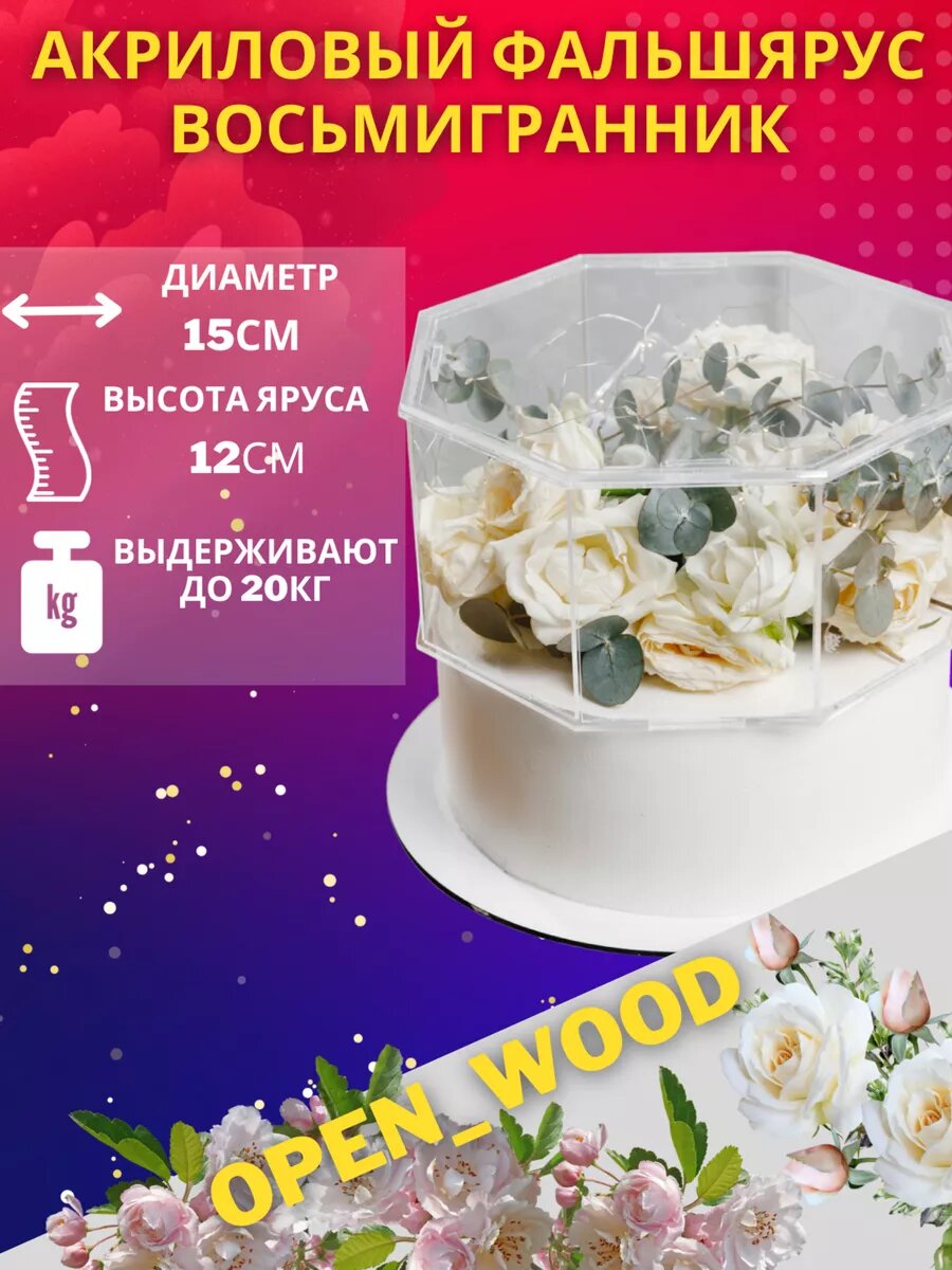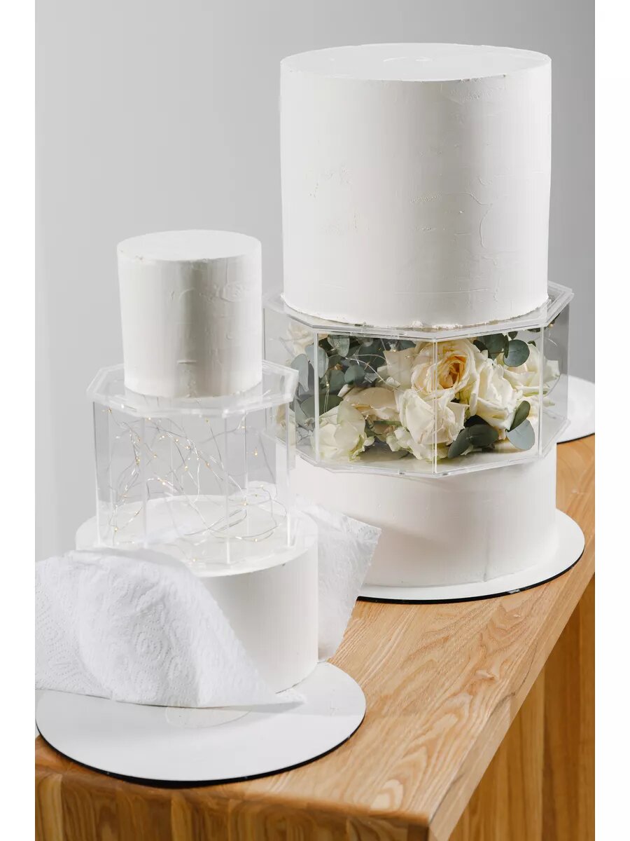Фальш ярус для торта из оргстекла - это идеальное решение для создания многоярусного торта, в котором не все ярусы являются настоящими. Он используется как подложка для торта или опора для ярусного торта, чтобы придать ему высоту и эффектность, создать дополнительные уровни торта. Незаменимый кулинарный инвентарь для кондитера и любителей выпечки. Максимальная нагрузка на межъярус для торта 20-30 кг. Фальшярусы для торта выполнены из прозрачного акрила толщиной 3мм и представляют собой неразъемную конструкцию. Для заполнения декором в фальшярусе предусмотрена съемная крышка. Несъедобный ярус муляж станет украшением свадебного торта и любого торта на заказ, межъярусное пространство можно наполнить флористическими композициями, цветами, сухоцветами, светодиодной гирляндой и другим декором. Фальшярус Восьмигранник упакован в прочную деревянную транспортировочную коробку, исключающую механические повреждения. Наполнение межъяруса не входит в комплект поставки. Диаметр отверстия для центральной оси 10,5 мм. Стенки цилиндра запрещается протирать спиртом/ацетоном и иными агрессивными растворами. Рекомендуется мыть мыльным раствором и без абразивных моющих средств/губок.