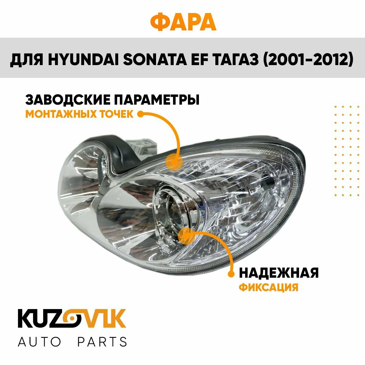 Новая фара с артикулом KZVK1510020046 производителя KUZOVIK предназначена для установки на автомобиль марки Hyundai модели Sonata, выпускаемого с 2001г по 2012г.