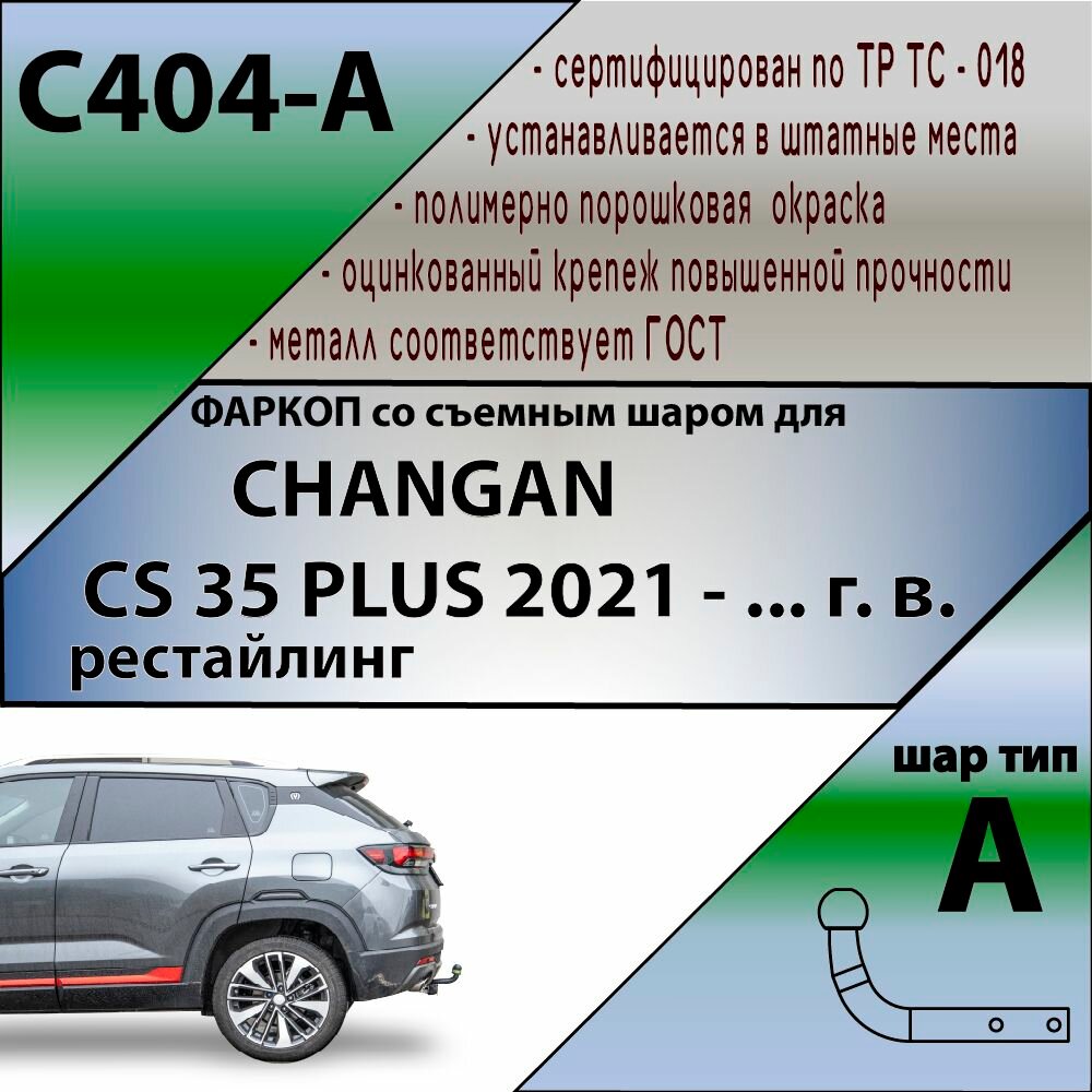 Фаркоп «Leader» CHANGAN CS35 PLUS 2021 - …. г. в. Артикул C404-А (съемный шар тип А) Тип соединения: шаровой Диаметр сцепного шара: 50 мм Вертикальная нагрузка на шар: не более 75 кг Допустимая полная масса прицепа: не более 750 кг Утилизация усилителя бампера: нет Сверление кузова / лонжеронов: нет Демонтаж бампера: да Вырез бампера: нет Блок согласования: рекомендуется SM-3.0 (KPL-031) / (KPL-024)
