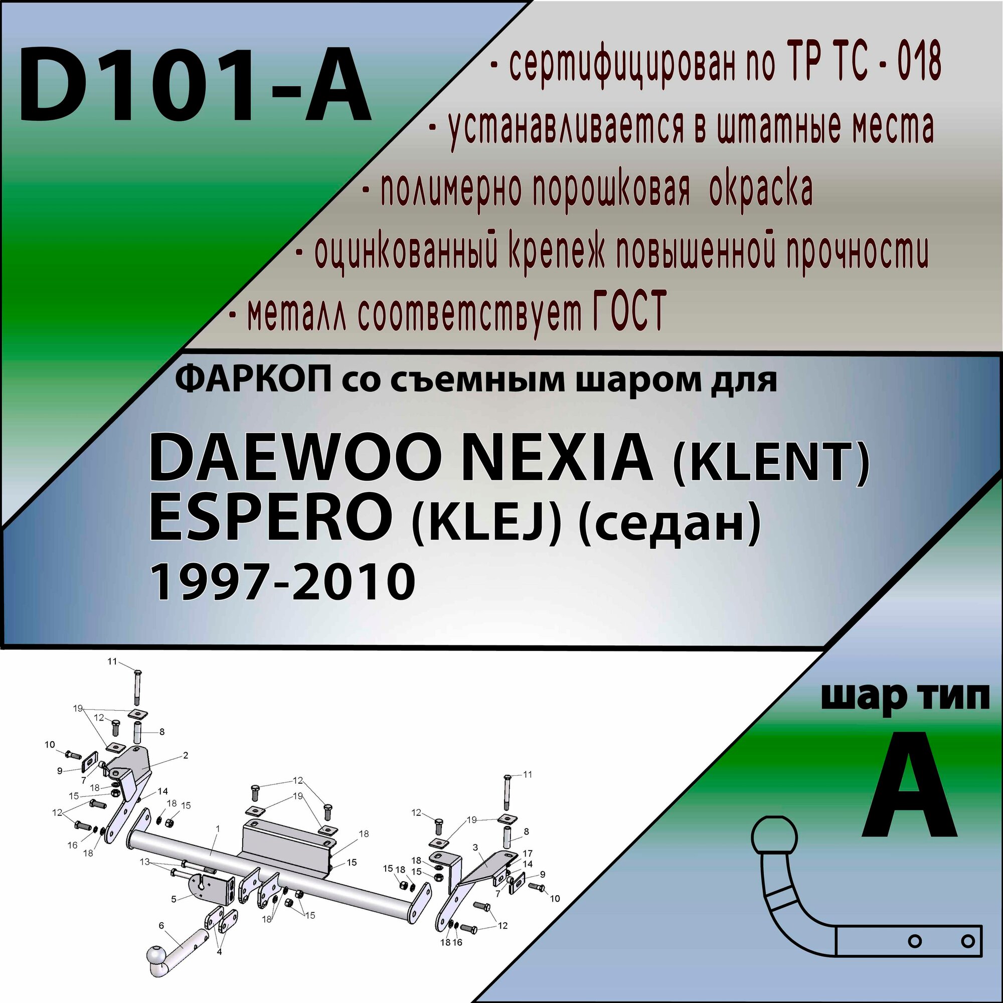 Фаркоп «Leader» DAEWOO NEXIA , DAEWOO ESPERO Артикул D101-A (съемный шар тип А) Тип соединения: шаровой Диаметр сцепного шара: 50 мм Вертикальная нагрузка на шар: не более 75 кг Допустимая полная масса прицепа: не более 1000 кг Утилизация усилителя бампера: нет Сверление кузова / лонжеронов: нет Демонтаж бампера: нет Вырез бампера: нет