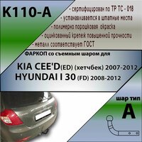 Фаркоп, прицепное устройство (ТСУ) KIA CEE'D (хетчбек) 2007 - г.в. HYUNDAI i30 (хетчбек) 2007 - г.в. Для автомобилей выпущенных c 2007 по 2012 --------------------------- Производитель: Лидер Плюс (Россия); Тип шара: съемный, тип "А"; Электрокомплект: приобретается отдельно (С этим ТСУ мы рекомендуем к приобретению KPL-012 Комплект электропроводки универсальный к ТСУ 1,8м.); Вырез бампера: не требуется; Снятие бампера: нет; Утилизация усилителя: нет; Сверление кузова / лонжеронов: нет; Максимальная масса буксируемого прицепа: 1200 кг; Вертикальная нагрузка: 75 кг; Масса ТСУ: 14.08 кг; Артикул: K110-A (съемный шар тип A)