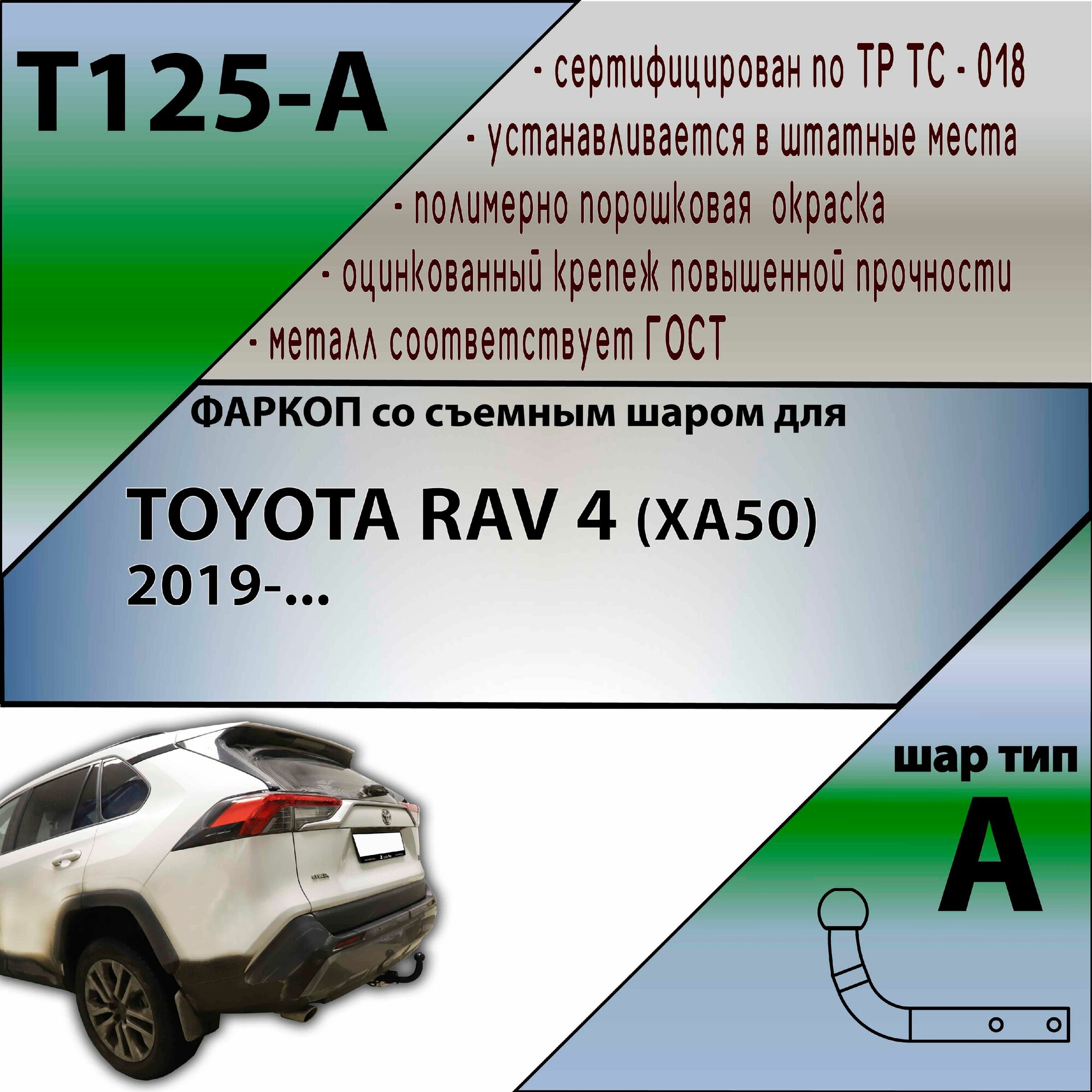 Фаркоп, прицепное устройство (ТСУ) TOYOTA RAV 4 (V) (внедорожник) номер кузова (XA50) 2019 - г. в. Для автомобилей выпущенных c 2019 по н.в --------------------------- Производитель: Лидер Плюс (Россия); Тип шара: съемный, тип "А"; Электрокомплект: приобретается отдельно (С этим ТСУ мы рекомендуем к приобретению KPL-024 Блок управления (smart connect) SM-3,0.); Вырез бампера: не требуется; Снятие бампера: нет; Утилизация усилителя: есть; Сверление кузова / лонжеронов: нет; Максимальная масса буксируемого прицепа: 1500 кг; Вертикальная нагрузка: 75 кг; Масса ТСУ: 17 кг; Артикул: T125-A (съемный шар тип A)
