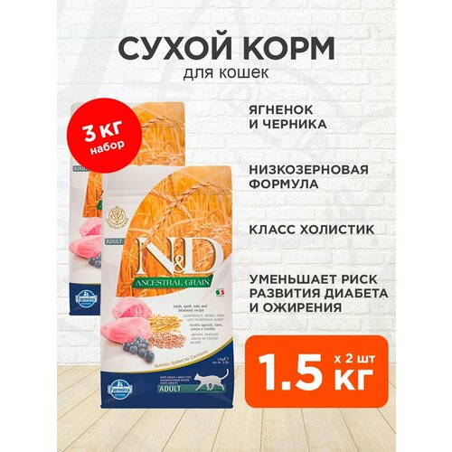 FARMINA CAT N&D ANCESTRAL GRAIN LAMB & BLUEBERRY низкозерновой для взрослых кошек с ягненком и черникой (1,5 + 1,5 кг): сравнение цен, характеристики, фото, актуальное наличие и цены.