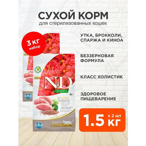 Полнорационный беззерновой сухой корм для кастрированных котов и стерилизованных кошек с уткой, брокколи, спаржей и киноа