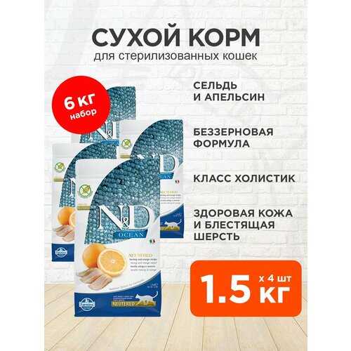 Полнорационный беззерновой корм для кастрированных котов и стерилизованных кошек с сельдью и апельсином.