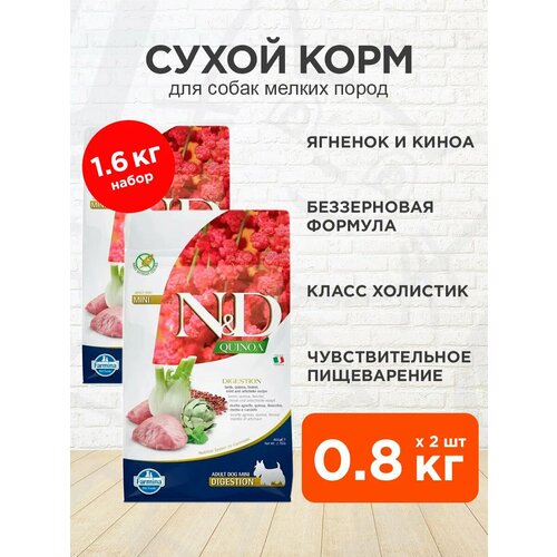 Полноценный сбалансированный диетический беззерновой рацион класса холистик с мясом ягненка, киноа, фенхелем, мятой и артишоками для взрослых собак маленьких пород с чувствительным пищеварением и при экзокринной недостаточности поджелудочной железы.