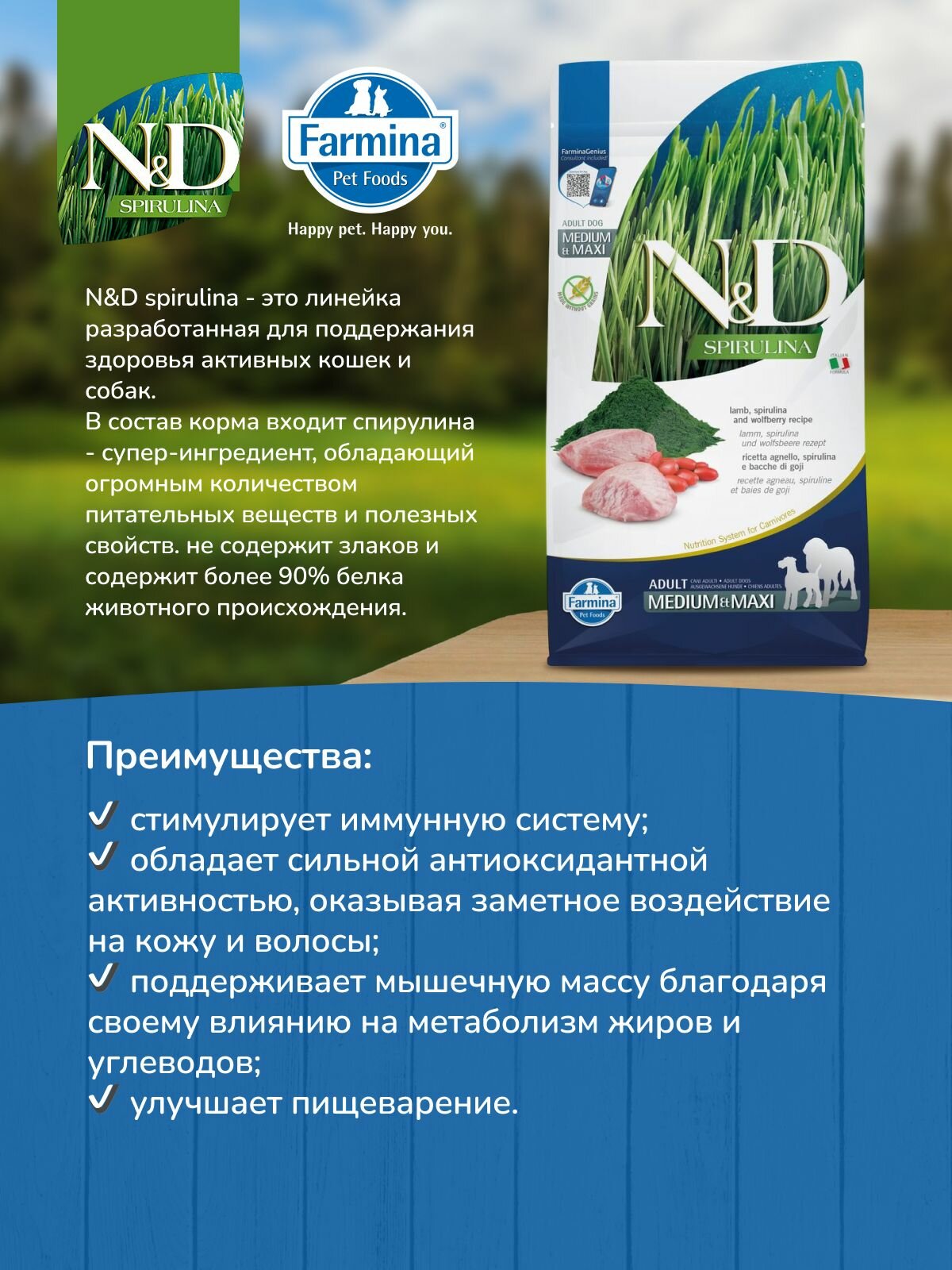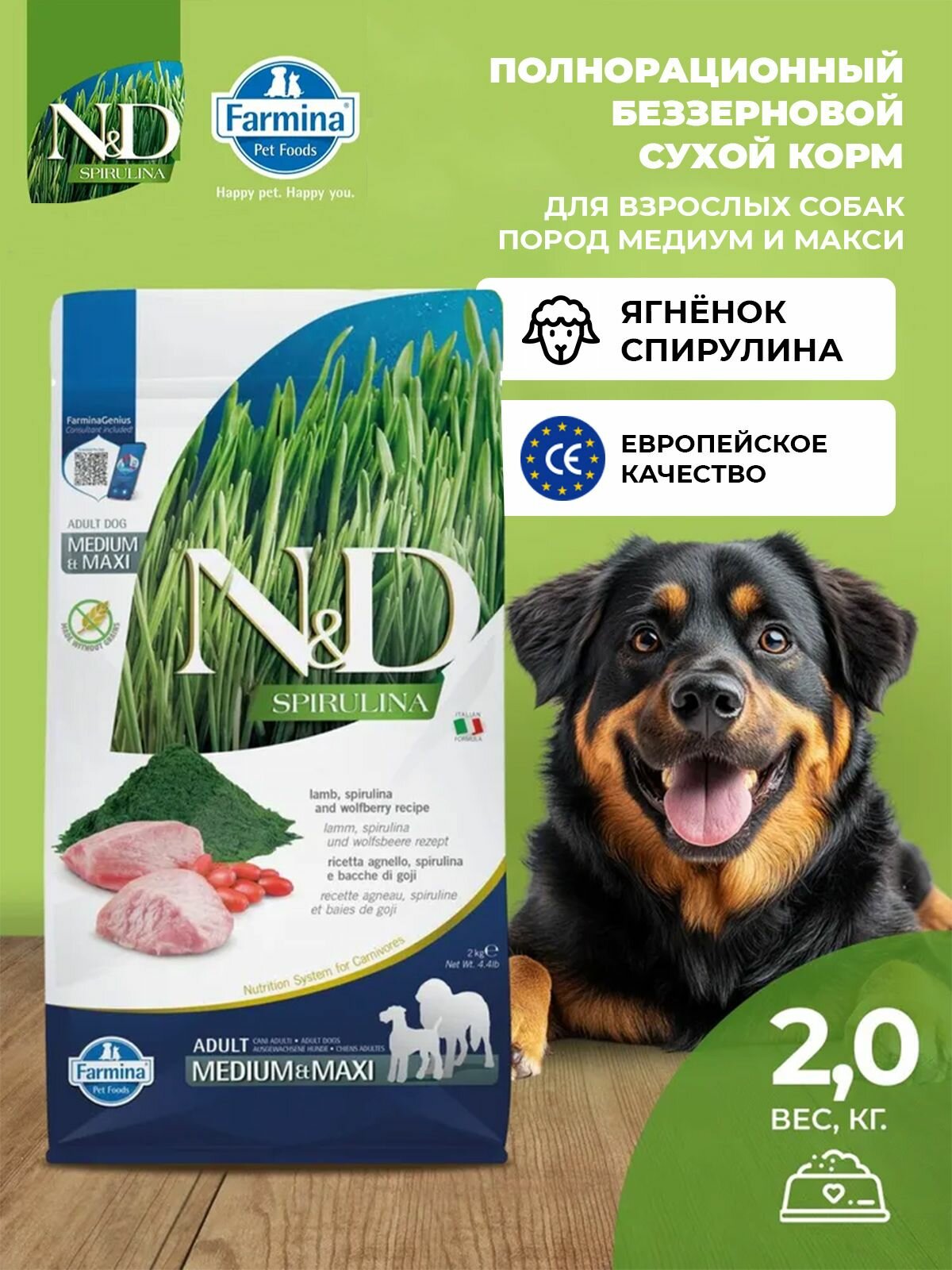 Купить Cухой корм для собак Farmina 2кг Н&Д Спирулина с ягненком Для взрослых медиум и макси с доставкой по всей России.