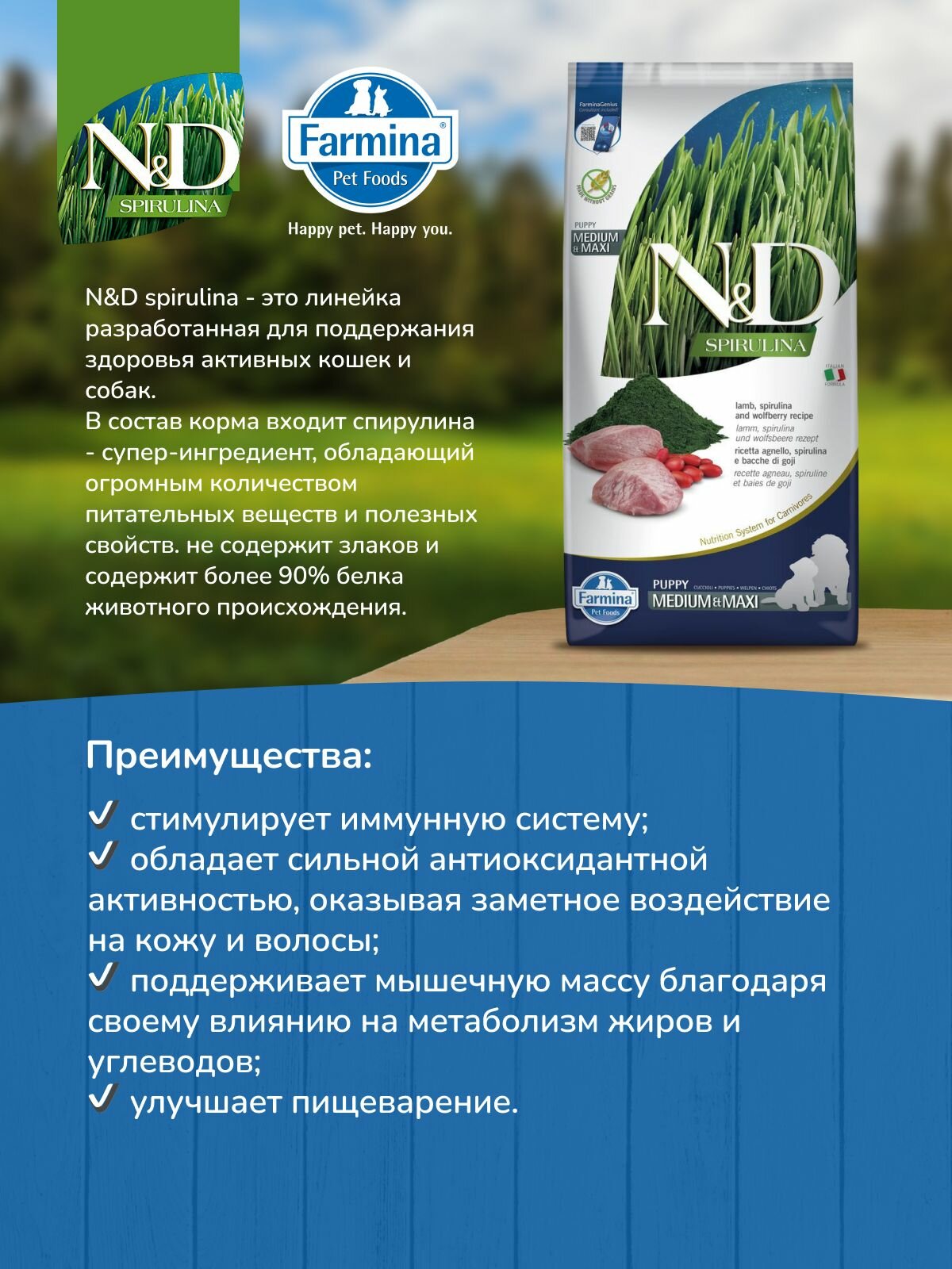 FARMINA N&D SPIRULINA – то линейка беззерновых кормов с высоким содержанием ингредиентов животного происхождения и спирулиной, овощами с превосходными питательными свойствами.