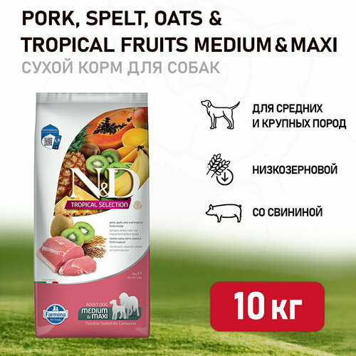 Полноценный сбалансированный низкозерновой рацион супер-премиум класса для взрослых собак средних и крупных пород со свининой, спельтой, овсом, манго, киви, анасом, папаей и бананом.