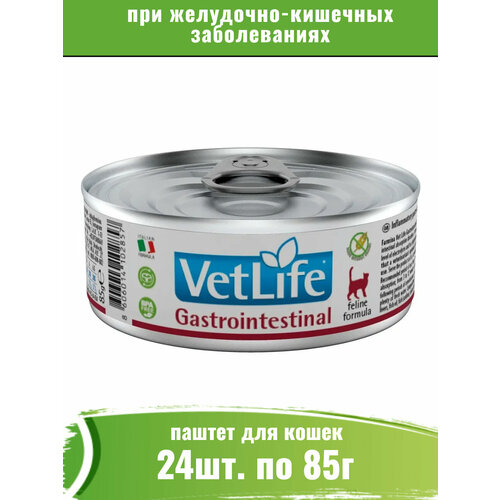 Farmina Vet Life Gastrointestinal - полнорационный диетический влажный корм для кошек, разработанный для пациентов с нарушениями процессов переваривания и всасывания в кишечнике. Способствует восстановлению процессов пищеварения благодаря повышенному содержанию электролитов и специально подобранным ингредиентам.
