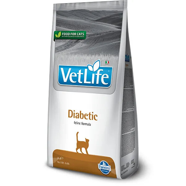 Farmina Vet Life Diabetic диетическое питание для кошек, разработанное для контроля уровня глюкозы в крови при сахарном диабете.