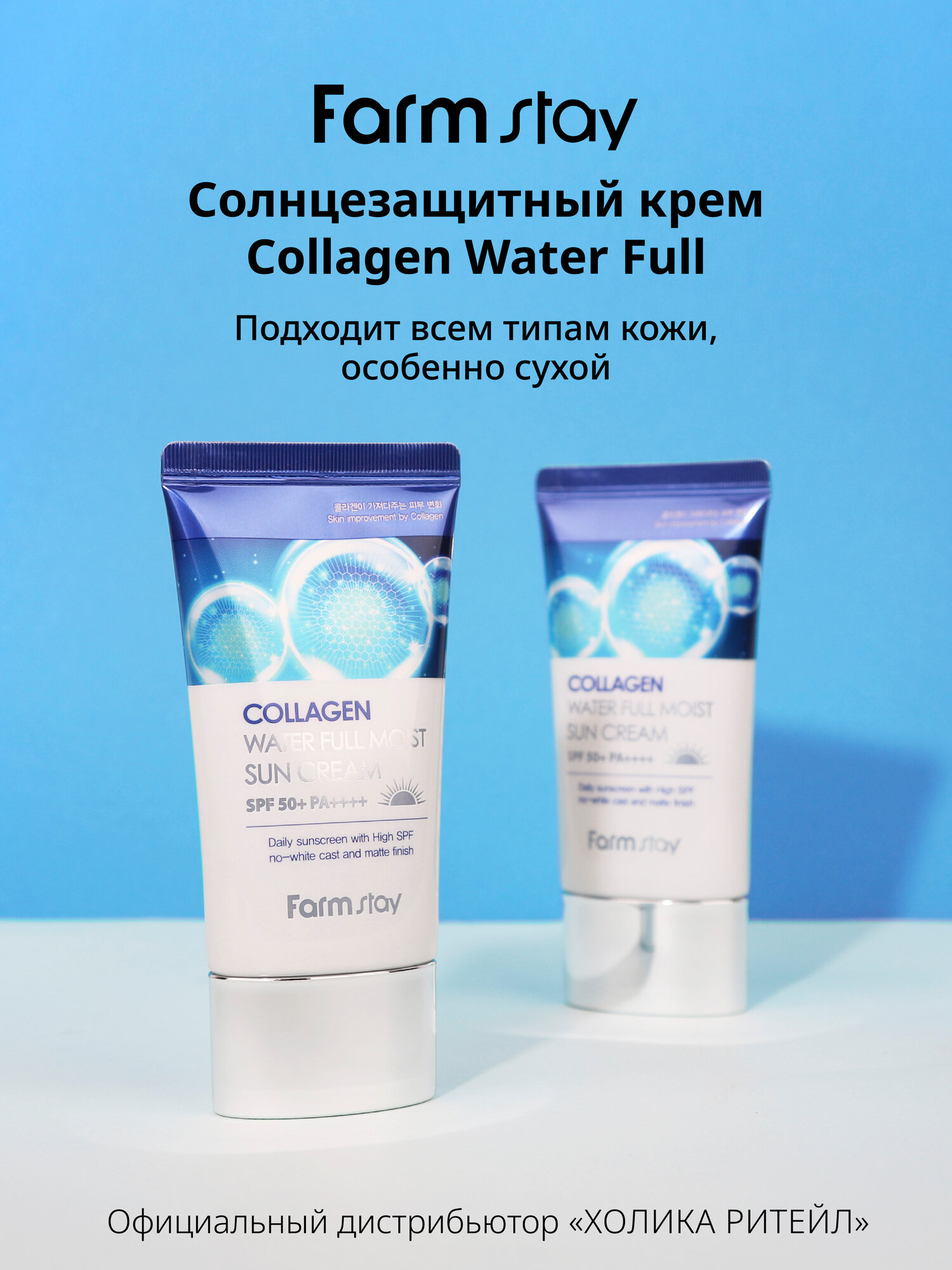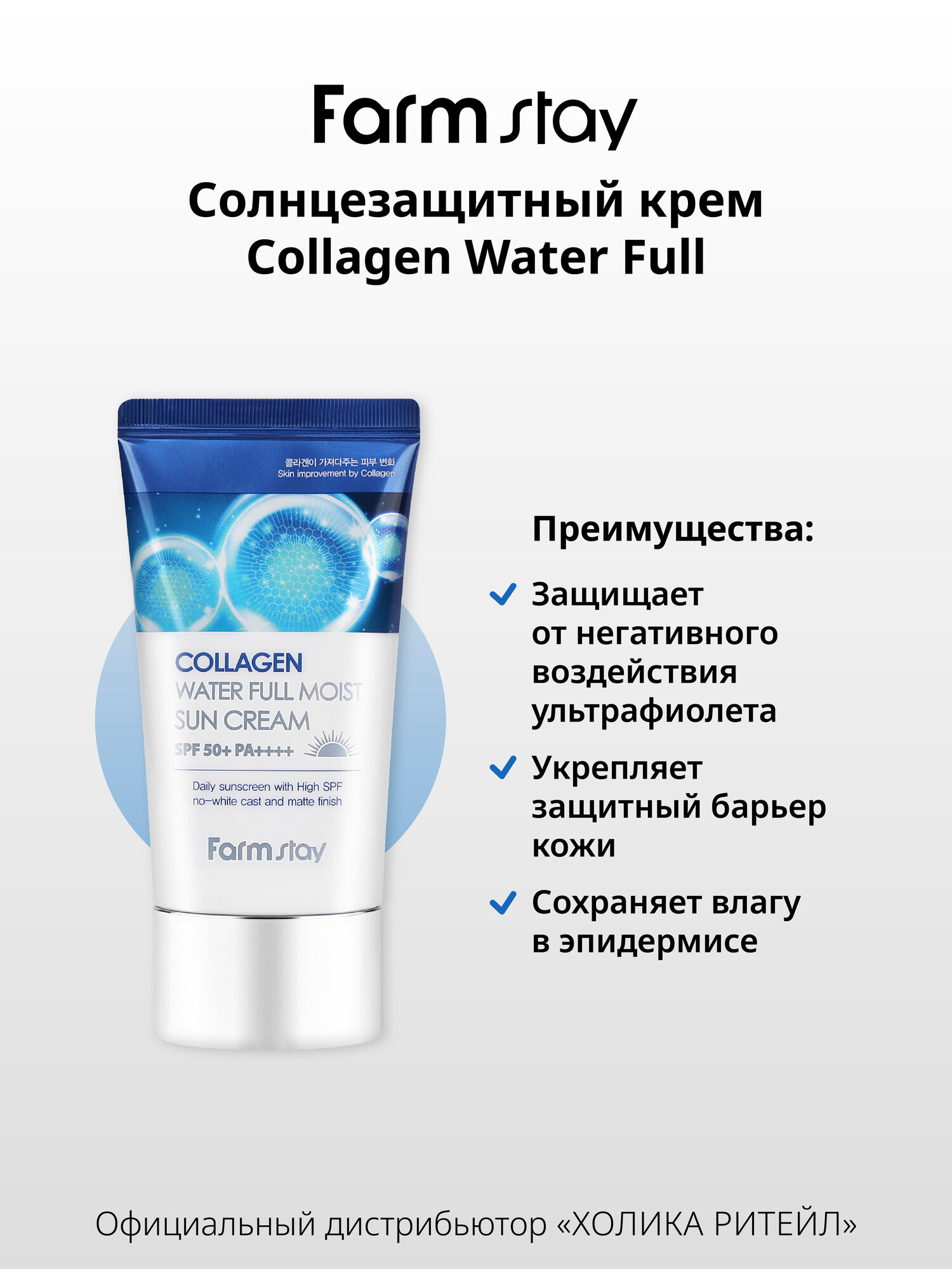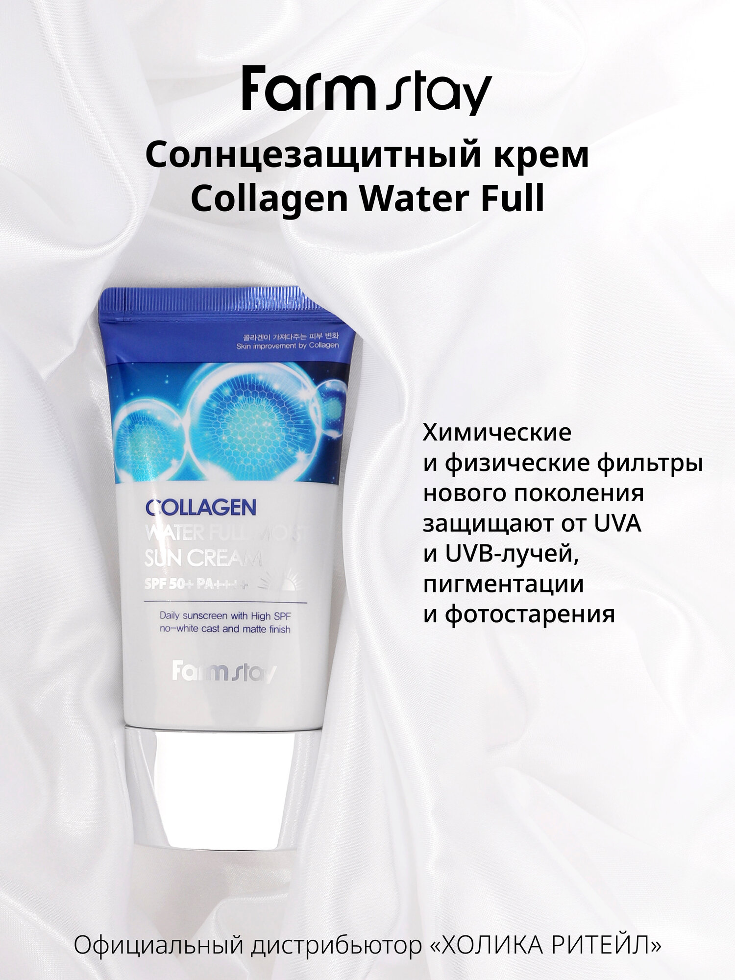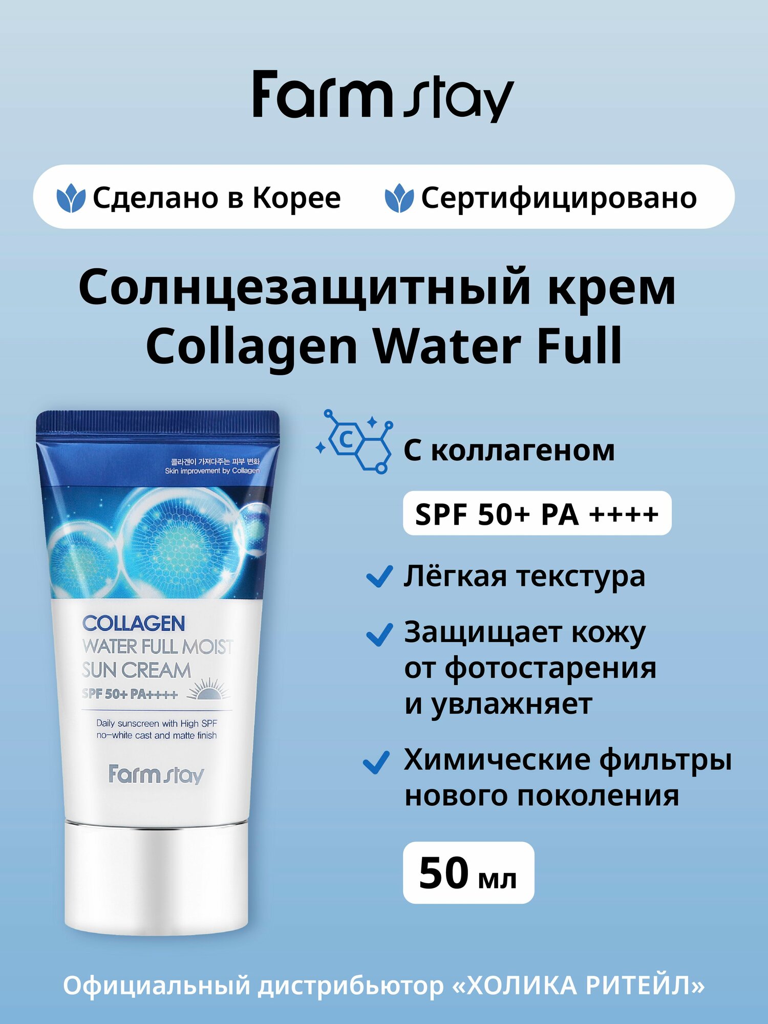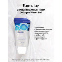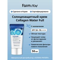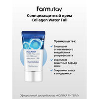 Увлажняющий солнцезащитный крем для ухода за кожей лица и шеи коллагеном SPF50+/PA++++, корейская косметика. 50г. Легкий солнцезащитный крем для лица и тела с коллагеном и с SPF50 обеспечивает превосходную защиту от лучей UVA и UVB. Увлажняющая формула крема невесомо ложится на кожу, не оставляет белых следов и ощущения липкости. В составе присутствуют химические фильтры для максимальной защиты от ультрафиолета SPF50+/PA++++. Гидролизованный морской коллаген подтягивает и укрепляет кожу, помогает поддерживать ее упругость и эластичность, а также способствует сохранению влаги. Крем подойдет для всех типов кожи, в том числе и для проблемной кожи лица, шеи и зоны декольте. Применение: нанесите небольшое количество средства на чистую кожу лица (поверх дневного ухода). Равномерно распределите, дайте впитаться. Обновляйте каждые 2-3 часа при постоянном нахождении на солнце. Идеальный подарок женщине, маме, подруге, девушке на день рождения, Новый год, 8 марта, день Святого Валентина. Рекомендуется к использованию в комплексе с серией корейской косметики для ухода за лицом и телом FarmStay / Фарм Стей. Способ применения: нанесите небольшое количество средства на чистую кожу лица (поверх дневного ухода). Равномерно распределите, дайте впитаться. Обновляйте каждые 2-3 часа при постоянном нахождении на солнце. Состав: Water, Dibutyl Adipate, Dipropylene Glycol, C12-15 Alkyl Benzoate, Ethylhexyl Salicylate, Diethylamino Hydroxybenzoyl Hexyl Benzoate, Dimethicone, Bis-Ethylhexyloxyphenol Methoxyphenyl Triazine, Butylene Glycol, Niacinamide, Ethylhexyl Triazone, 1,2-Hexanediol, Glycerin, Hydrogenated Lecithin, Cetearyl Alcohol, Glyceryl Stearate, PEG-100 Stearate, Ammonium Acryloyldimethyltaurate/VP Copolymer, Polymethylsilsesquioxane, Silica, Sodium Acrylate/Sodium Acryloyldimethyl Taurate Copolymer, Fragrance / Parfum, Isohexadecane, Dimethiconol, Ethylhexylglycerin, Caprylyl Glycol, Arginine, Acrylates Copolymer, Polysorbate 80, Xanthan Gum, Adenosine, Disodium EDTA, Sorbitan Oleate, Portulaca Oleracea Extract, Freesia Refracta Extract, Hydrolyzed Collagen, Camellia Japonica Flower Extract, Magnolia Kobus Branch/Flower/Leaf Extract, Nelumbo Nucifera Flower Extract, Prunus Persica (Peach) Flower Extract, Prunus Mume Flower Extract, Limonene, Linalool, Butylphenyl Methylpropional, Benzyl Salicylate, Hexyl Cinnamal, Geraniol.