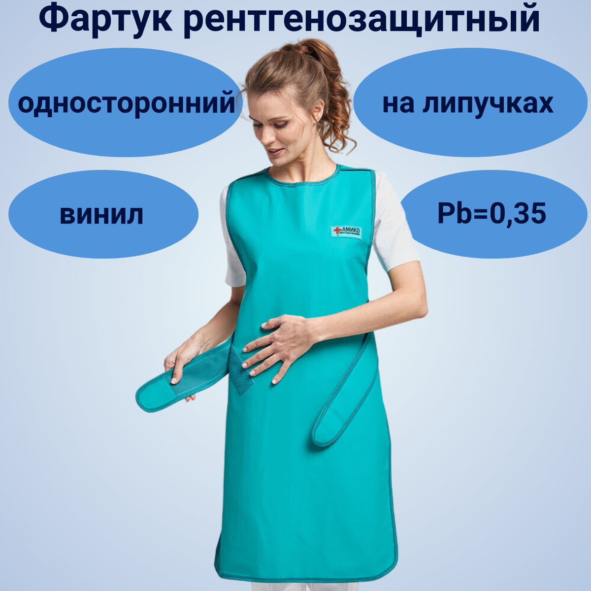 Фартук рентгензащитный односторонний для персонала производства. Свинцовый эквивалент 0,35 Pb. Используется для радиационной защиты передней части тела человека. Модель изготовлена из многослойного полихлорвинила и снабжена практичными застежками в виде липучек, что позволяет регулировать размер изделия в пределах 46-54. Винил отличается гибкостью, мягкостью и легкостью.