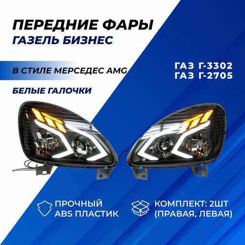 Цена указана за Фары Газель Бизнес тюнинг АМГ с ДХО с плавающими поворотниками, комплект левая правая фара в сборе арт. 33020-3711010 для ГАЗ Г-3302, 2705 комплект 2шт.
