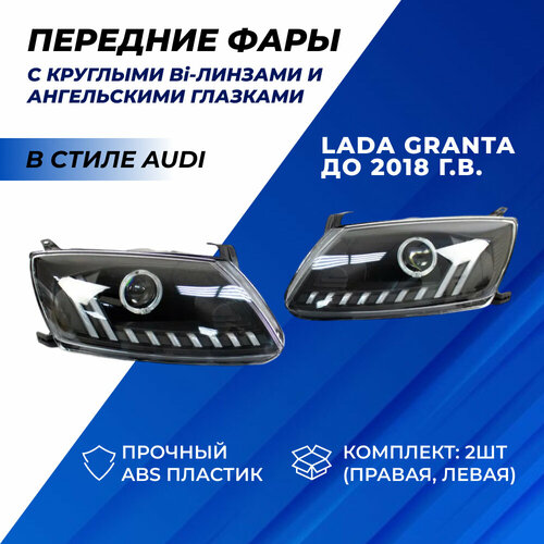 Цена указана за комплект Фары Гранта передние круглая би-линза, тюнинг ДХО и плавающие поворотники в стиле Ауди AUDI, без ангельских глазок, левая правая фара на Lada Granta до 2018 г. в. комплект 2шт.