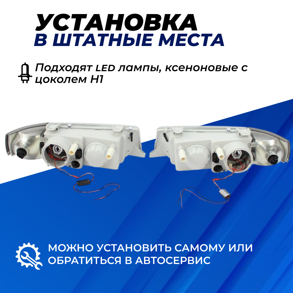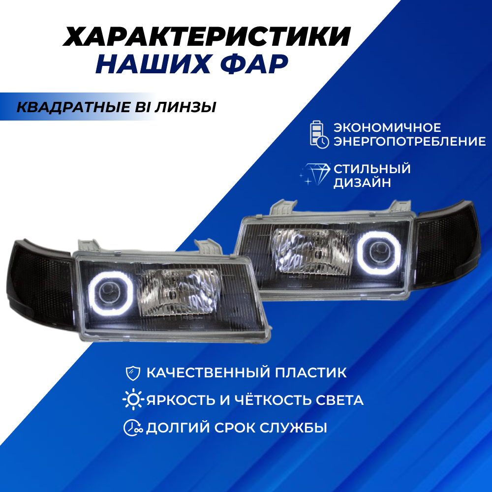 Фары ВАЗ 2110 квадратные би линзы с ангельскими глазками, черная маска (тонированные поворотники) левая правая фара на ВАЗ 2110-2112 отлично подойдут для тех, кто хочет придать своему автомобилю неповторимый и модный внешний вид. Благодаря своему стильному дизайну тюнинг фары ваз 2110 сделают ваш автомобиль похожим на знаменитые модели. Фары ВАЗ 2110, 2111, 2112 передние тюнинг ангельские глазки работают в режиме ДХО . Одним из главных преимуществ Фары ВАЗ 2110 являются тонированные поворотники, которые помогут сделать ваш автомобиль еще более стильным и ярким. Это очень важно для безопасности на дороге, так как яркие поворотники сделают вашу интенцию поворота более заметной для других водителей. Установка Фары ВАЗ 2110 очень простая, они могут быть установлены штатно, без необходимости в доработках или модификациях. Это позволит вам значительно сэкономить время и деньги на монтаже. Обратите внимание, что Фары ВАЗ 2110 передние тюнинг оснащены би линзами, что позволяет им выделяться особенной яркостью и четкостью света.