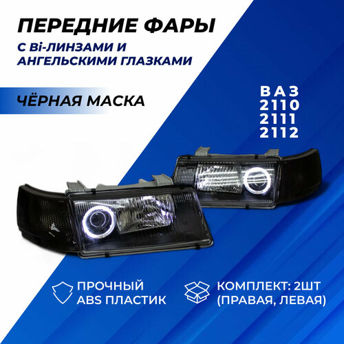 Цена указана за комплект Фары ВАЗ 2110, 2111, 2112 би линзы, тюнинг ДХО в стиле круглые ангельские глазки, черная маска, комплект левая правая фара с тонированными поворотниками 2шт.