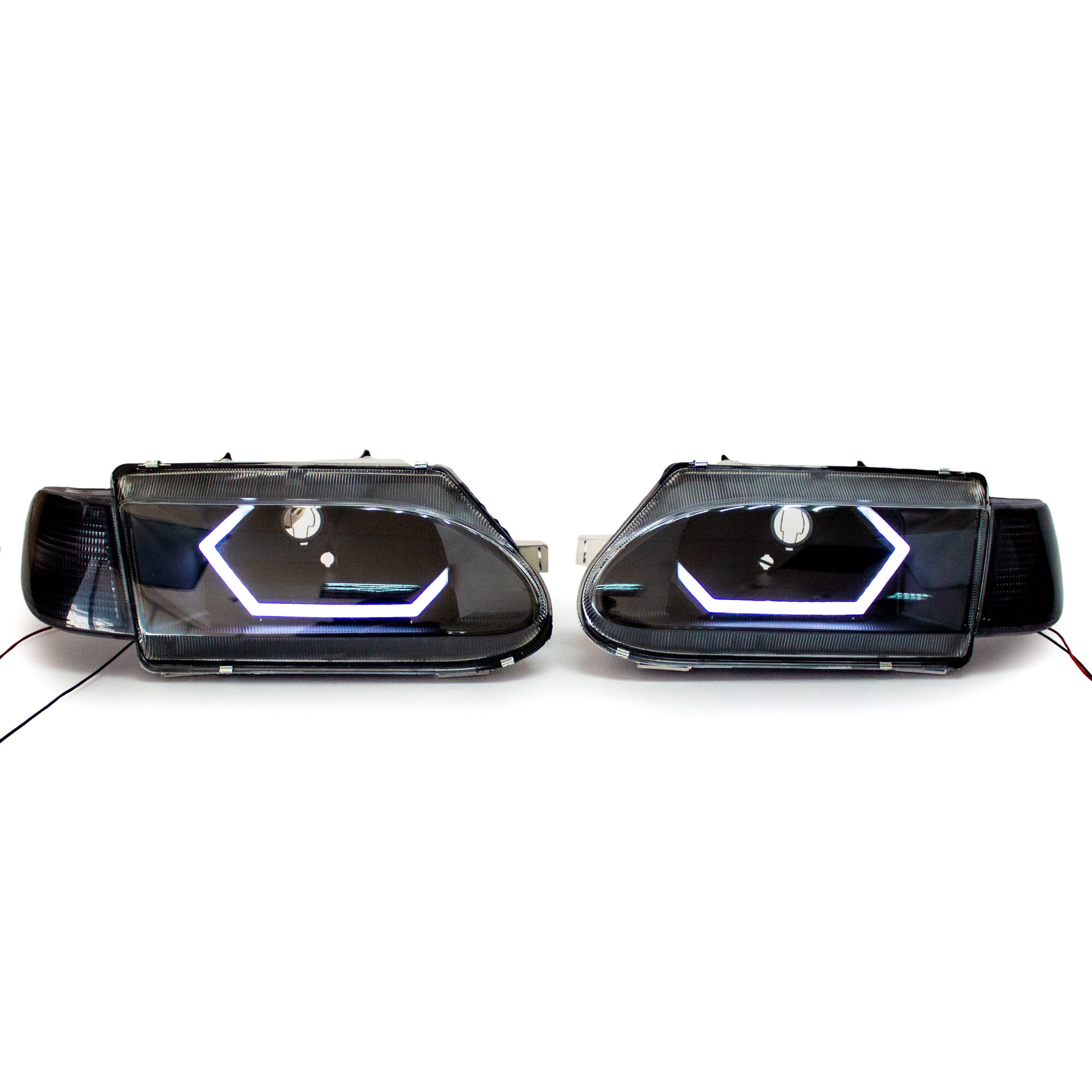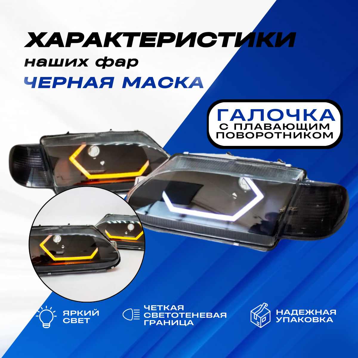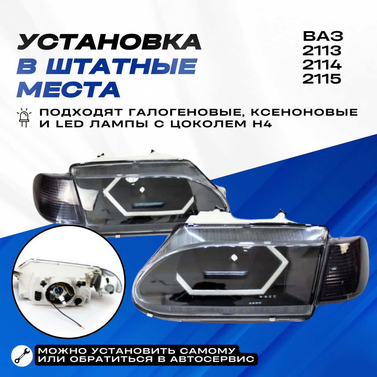 Фары ВАЗ 2114 тюнинг в стиле Ауди Audi с led ДХО левая правая фара с дневными ходовыми огнями на ВАЗ 2113-2115, черная маска с тонированными поворотниками, комплект 2шт.