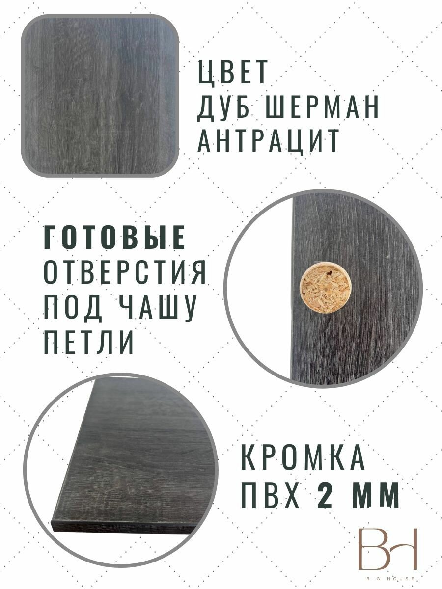 Фасад кухонный универсальный для навесных и напольных шкафов - быстрый способ обновления интерьера кухни. Фасад изготовлен из ЛДСП фирмы Egger толщиной 16 мм. Торцы фасада облицованы кромкой ПВХ, что позволяет защищать их от повреждений, увеличивая срок эксплуатации изделия. На фасаде предусмотрены вырезы под петли. Дверь универсальная, правостороннее и левостороннее использование. Подойдет для верхних и нижних модулей кухни. Дуб Шерман представляет собой очень рустикальную репродукцию дуба с эффектом изношенности, при этом цветовой оттенок антрацит в сочетании со структурой ST32 Филвуд винтажный из серии «Синхронные поры» поддерживает модную тенденцию к использованию чёрных древесных репродукций, вплоть до имитаций сгоревшей древесины.