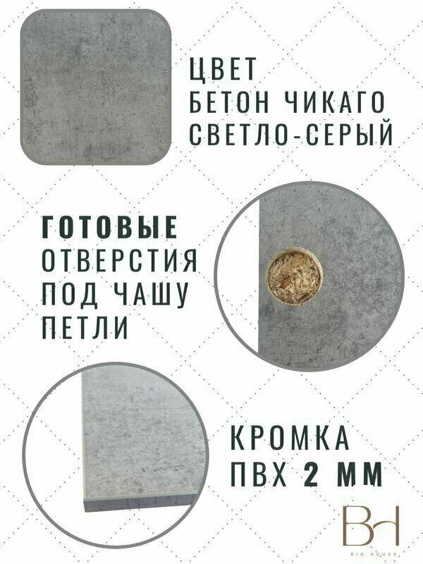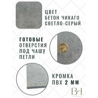 Фасад кухонный универсальный для навесных и напольных шкафов - быстрый способ обновления интерьера кухни. Фасад изготовлен из ЛДСП фирмы Egger толщиной 16 мм. Торцы фасада облицованы кромкой ПВХ, что позволяет защищать их от повреждений, увеличивая срок эксплуатации изделия. На фасаде предусмотрены вырезы под петли. Дверь универсальная, правостороннее и левостороннее использование. Подойдет для верхних и нижних модулей кухни. Декор Бетон Чикаго светло-серый на внешний вид напоминает холодноватую поверхность бетона и в настоящее время используется не только в дизайне столешниц, но и для обшивки стен внутренних помещений или даже в дизайне мебели. Эта репродукция бетона смотрится очень аутентично и на больших площадях, так как увеличенный раппорт в формате XL редко повторяет рисунок. Структура ST9 Мягкий матовый придаёт поверхности декора соответствующую прохладность и матовость на ощупь.