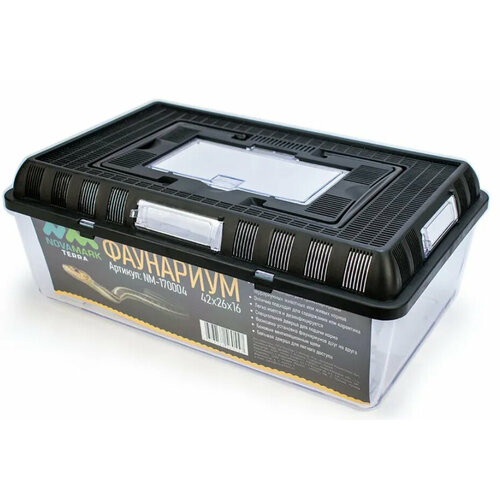 Фаунариум NOVAMARK TERRA представляет собой многоцелевой пластиковый террариум. Его можно использовать для временного содержания животного или карантина, либо в качестве переноски при транспортировке. Оборудован специальной дверцей для кормления на передней стенке крышки для обеспечения наилучшего доступа для кормления, когда контейнеры установлены друг на друга. Это облегчает кормление и снижает стресс, поскольку отпадает необходимость перемещать ёмкость для доступа к животным. Вентиляционные отверстия обеспечивают оптимальный постоянный приток воздуха, даже когда контейнеры поставлены друг на друга.