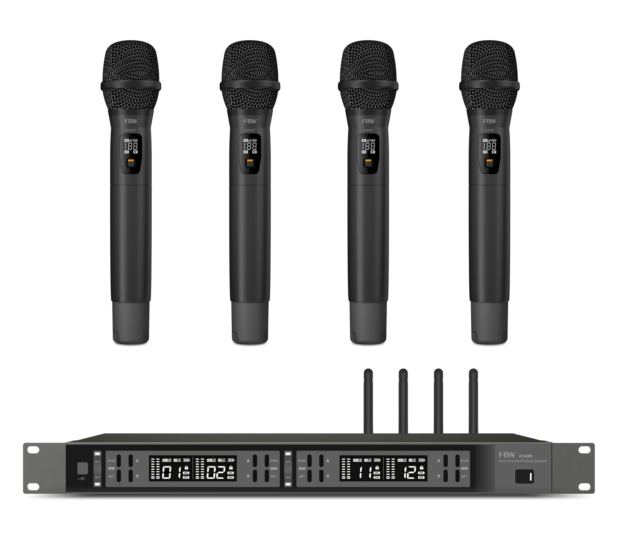 FBW A4-VOCAL1 четырёхканальная вокальная радиосистема, A140R+4xA101HT, 512-562МГц, FM-модуляция, 2/10/30мВт, 3 уровня Squelch, индикация батареи, 50Гц
