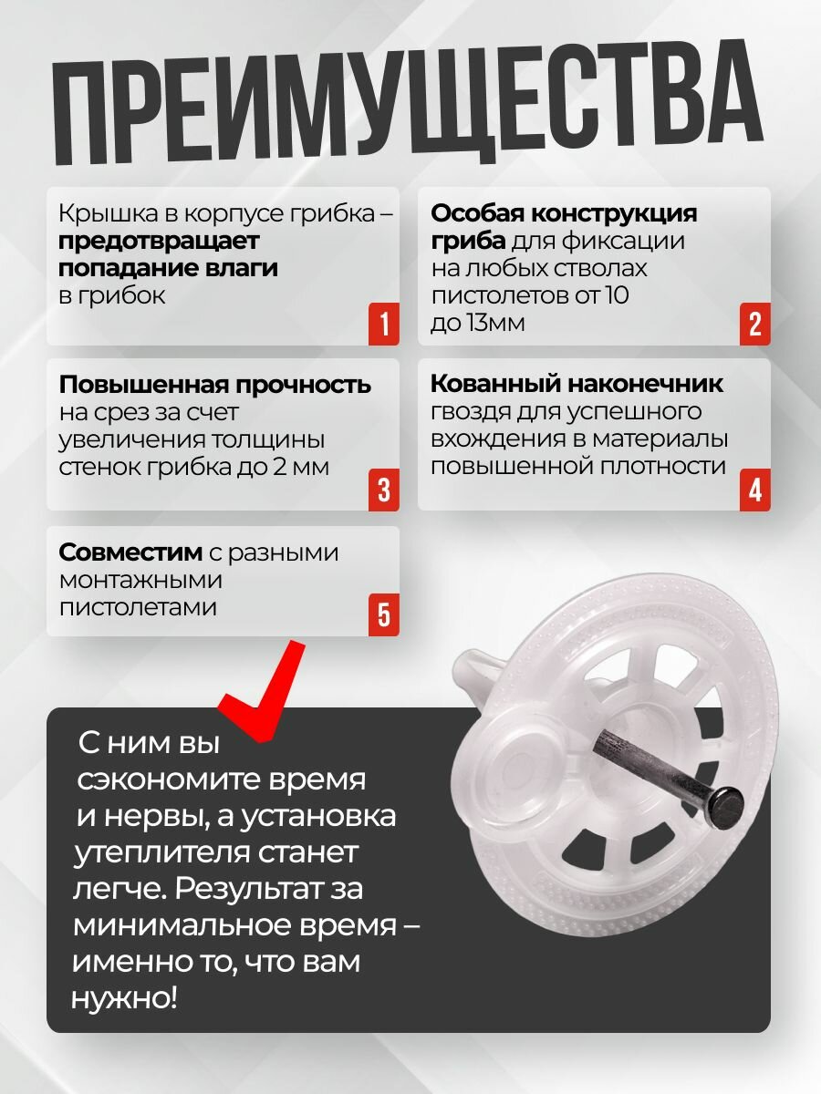 Новая модель! Тарельчатый дюбель гриб с крышкой и гвоздем для обычного бетона и кирпича предназначен для прямого монтажа теплоизоляции к конструкциям из бетона и кирпича. Универсальная модель, которая может использоваться с газовыми, пневматическими и пороховыми пистолетами для теплоизоляции. Отличается увеличенным до 60мм диаметром рондоли и крышкой в теле грибка.