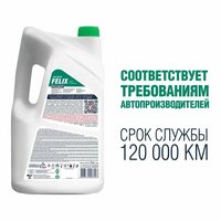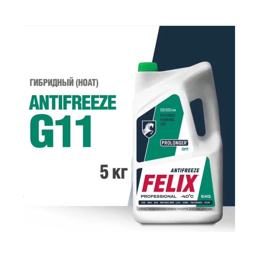Антифриз FELIX® PROLONGER® представляет собой жидкость охлаждающую низкозамерзающую на основе этиленгликоля и специально очищенной воды, не содержащую аминов, фосфатов и боратов. Разработан по гибридной технологии, содержит в себе набор силикатных присадок. обеспечивает быстрый прогрев двигателя при отрицательных температурах окружающего воздуха до –40°С; исключает возможность образования накипи и отложений; обладает повышенной термостабильностью и теплопроводностью; имеет оптимальные смазывающие свойства; готов к применению. Соответствует требованиям международных стандартов: ASTM D 3306, ASTM D 4985, SAE J 1034, BS 6580:1992. Соответствует требованиям стандарта G11 по классификации Volkswagen. Срок службы антифриза – 120 000 км или 3 года.