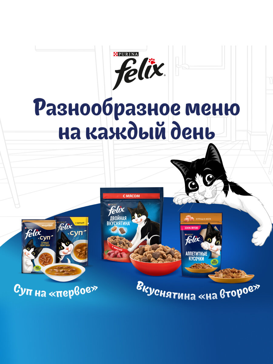Корм FELIX® Мясное Объедение – это микс хрустящих гранул естественной формы с повышенным содержанием белка, созданный, чтобы побаловать Вашего кота всей полнотой мясного вкуса, которую он заслуживает. Ваш пушистый озорник полюбит яркий вкус корма FELIX® Мясное Объедение, ведь он изготовлен без добавления искусственных красителей, ароматизаторов и консервантов! Ваш любимец также оценит сочетание мясных ингредиентов и овощей, ведь кошки так любят разнообразие в питании. И это еще не все! Корм FELIX® Мясное Объедение содержит оптимальное сочетание сбалансированных минеральных веществ и витаминов. Он на 100% удовлетворяет ежедневные потребности Вашего питомца в правильном питании. Пожалуйста, следуйте рекомендациям по кормлению, указанным на упаковке.