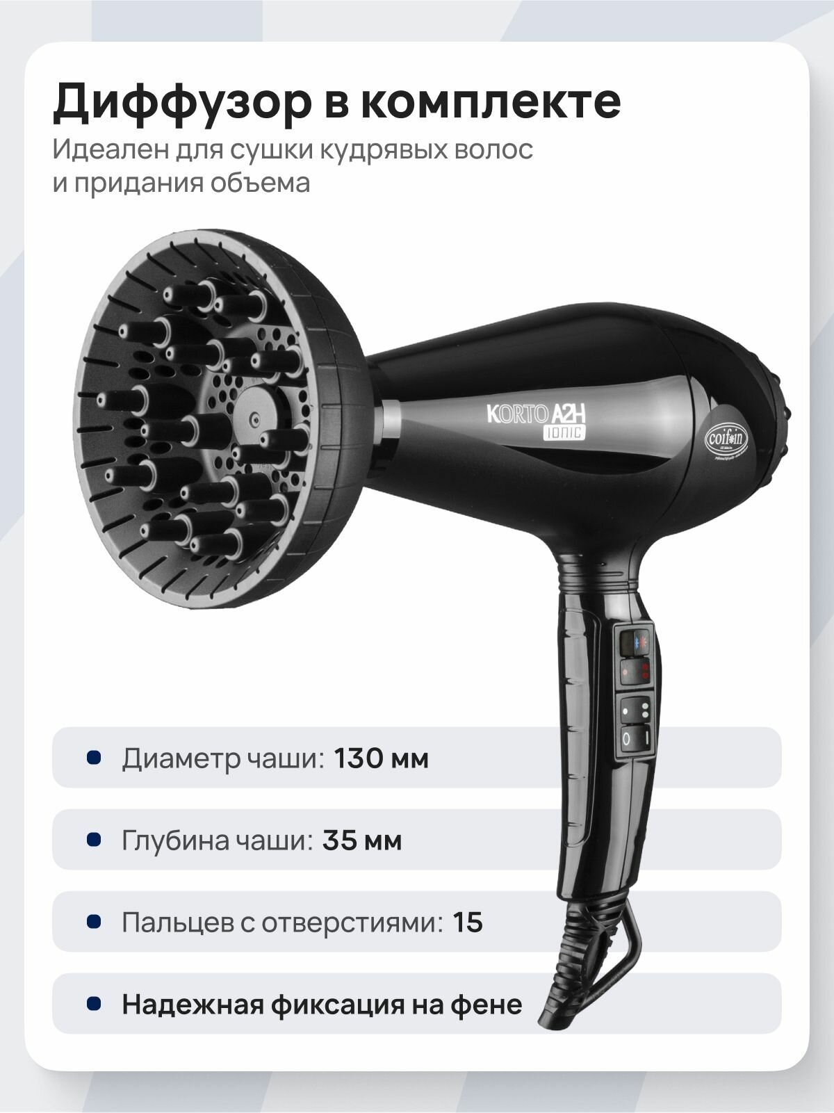 Фен Coifin Korto Ionic KA2 H с диффузором BABD11E, профессиональный, с ионизацией, 2200 Вт: сравнение цен, характеристики, фото, актуальное наличие и цены.