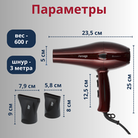 технические характеристики: мощность 2200 Вт; система ионизации вес 600 гр; 6 режимов работы кнопка мгновенного охлаждения 2 сопла, шнур — 2,8м.