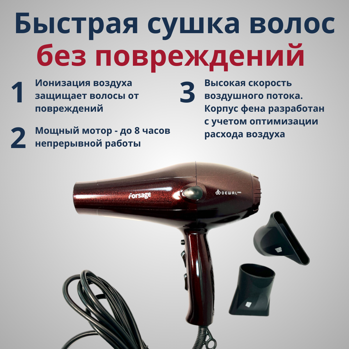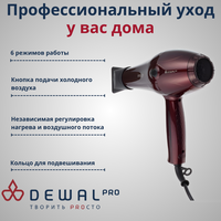 Преимущества фенов DEWAL: - Мощный мотор – до 8 часов непрерывной работы; - Высокая скорость воздушного потока. Корпус фена разработан с учетом оптимизации расхода воздуха; - Защита от перегрева Stop-heat. Защитный механизм на нагревательном элементе фена охлаждает корпус , сохраняет мотор, защищая его от перегрева а также поддерживает оптимальную температуру для волос;