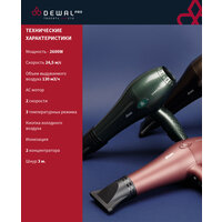 DEWAL Pro запускает в ассортимент новую линейку мощных фенов в благородных осенних цветах. Изысканный темный шоколад, утонченное красное вино и изумрудная зелень ели – вот идеальное сочетание, чтобы раскрасить пасмурные будни! Профессиональные фены DEWAL Pro BLUES – это невероятная мощность в 2600 Вт и высочайшая скорость потока, что многократно ускоряет работу мастера в салоне. Многообразие сочетаний температурных и скоростных режимов, а также кнопка быстрой подачи холодного воздуха позволяют настроить идеальную комбинацию для сушки и укладки любого типа волос. Удлиненная носовая часть особенно порадует мастеров, которые любят перекидывать пряди длинных волос через фен для удобства сушки и укладки. Съемный воздушный фильтр для легкого ухода за мотором, 2 сопла и сетевой провод длиной 3 метра – фены DEWAL Pro BLUES обладают всеми необходимыми качествами для обеспечения комфорта мастера везде и всегда. C DEWAL Pro – Творить просто!