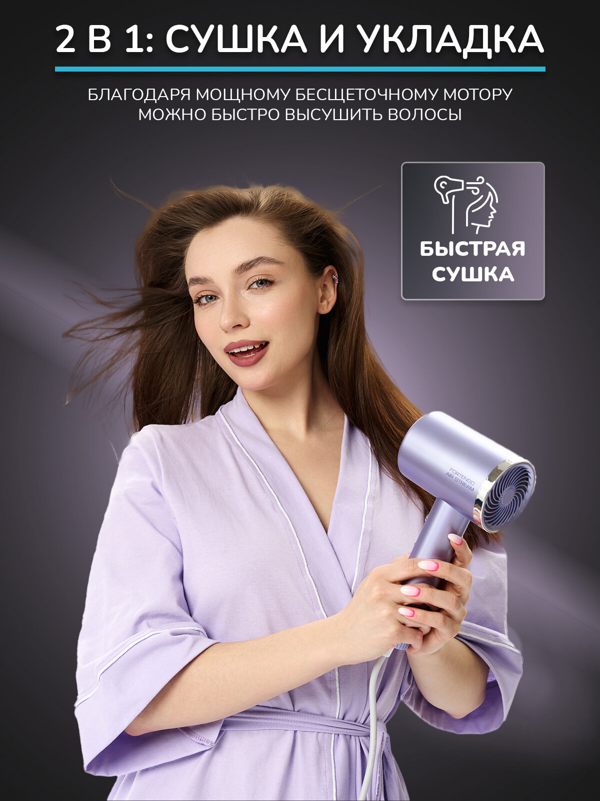 Фен FORTENGO AIR STREAM D1 – это новые и безопасные технологии для ухода за волосами в домашних условиях. Они позволяют свести к минимуму микроповреждения волос от воздействия температуры, расчесывания, применения различных средств для окрашивания, укладки и стайлинга.