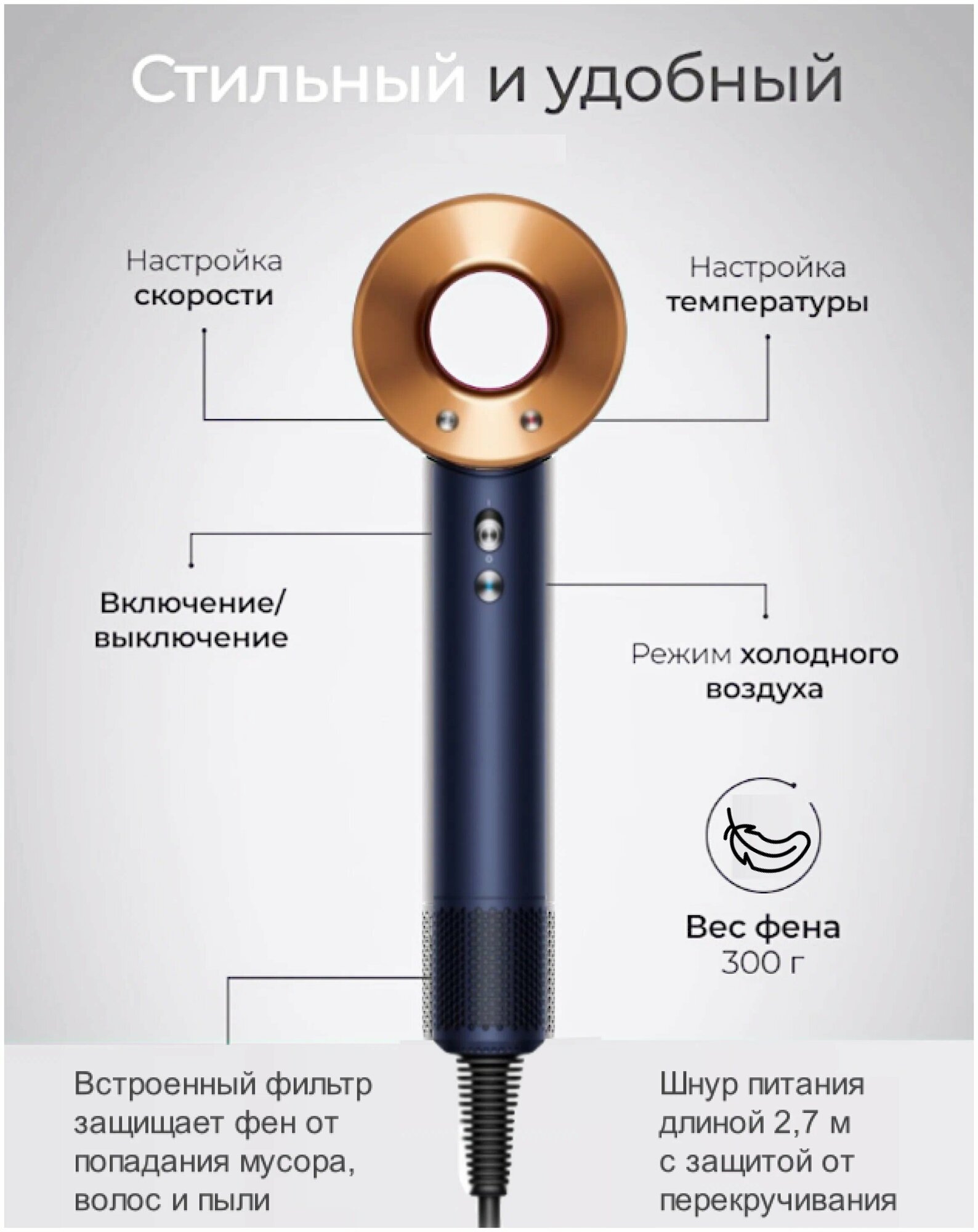 | Насадки | диффузор, для бережного высушивания, для непослушных волос, концентратор |