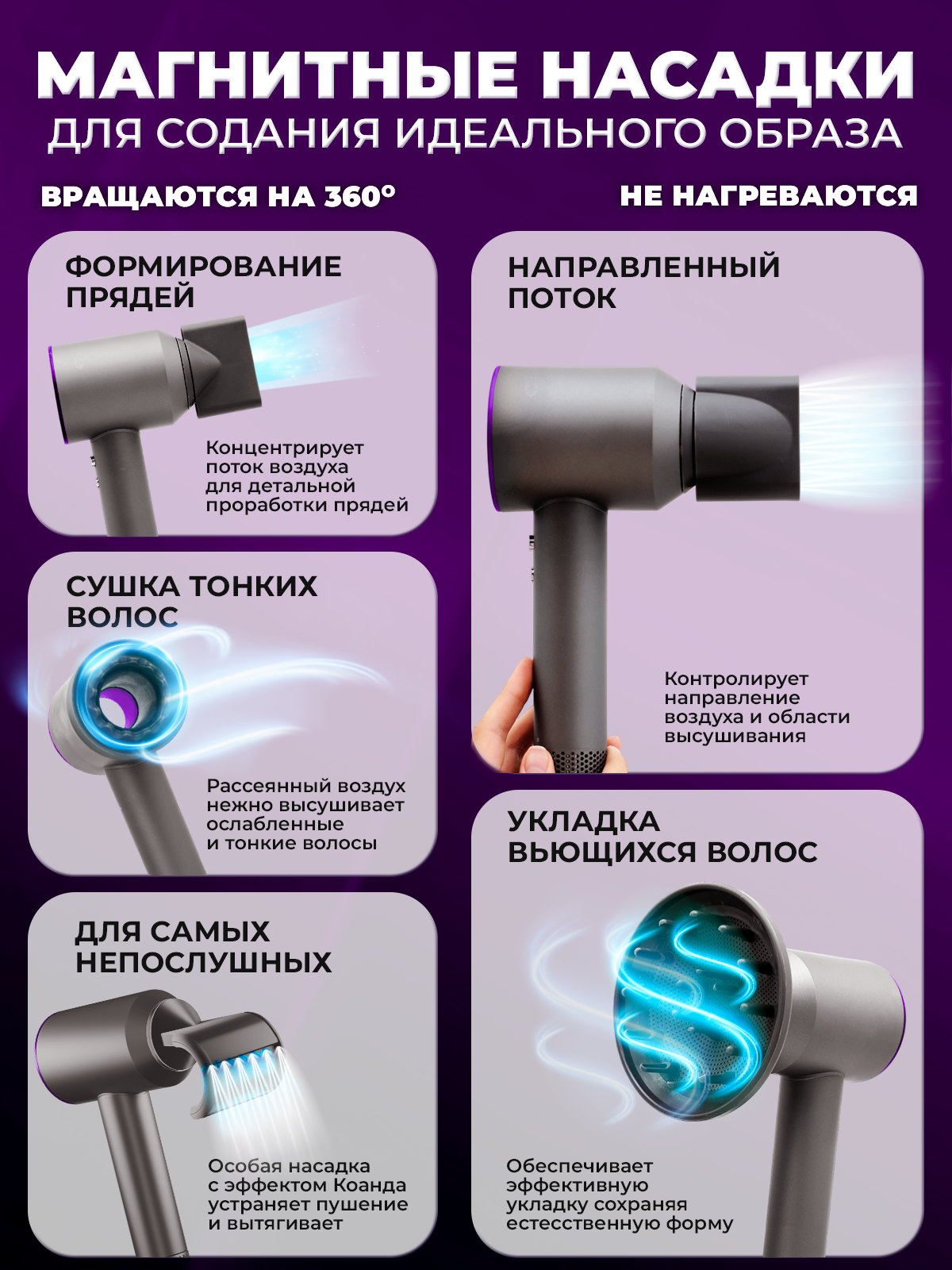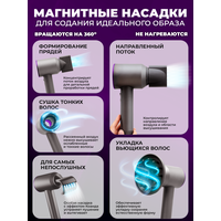 Комплект включает магнитные насадки, такие как круглая щетка для укладки, диффузор для создания объема и укладки кудрявых волос, а также насадки для направленного воздушного потока и концентратор для точной укладки. Это делает прибор отличным выбором как для выпрямления, так и для работы с кудрями и волнистыми волосами.