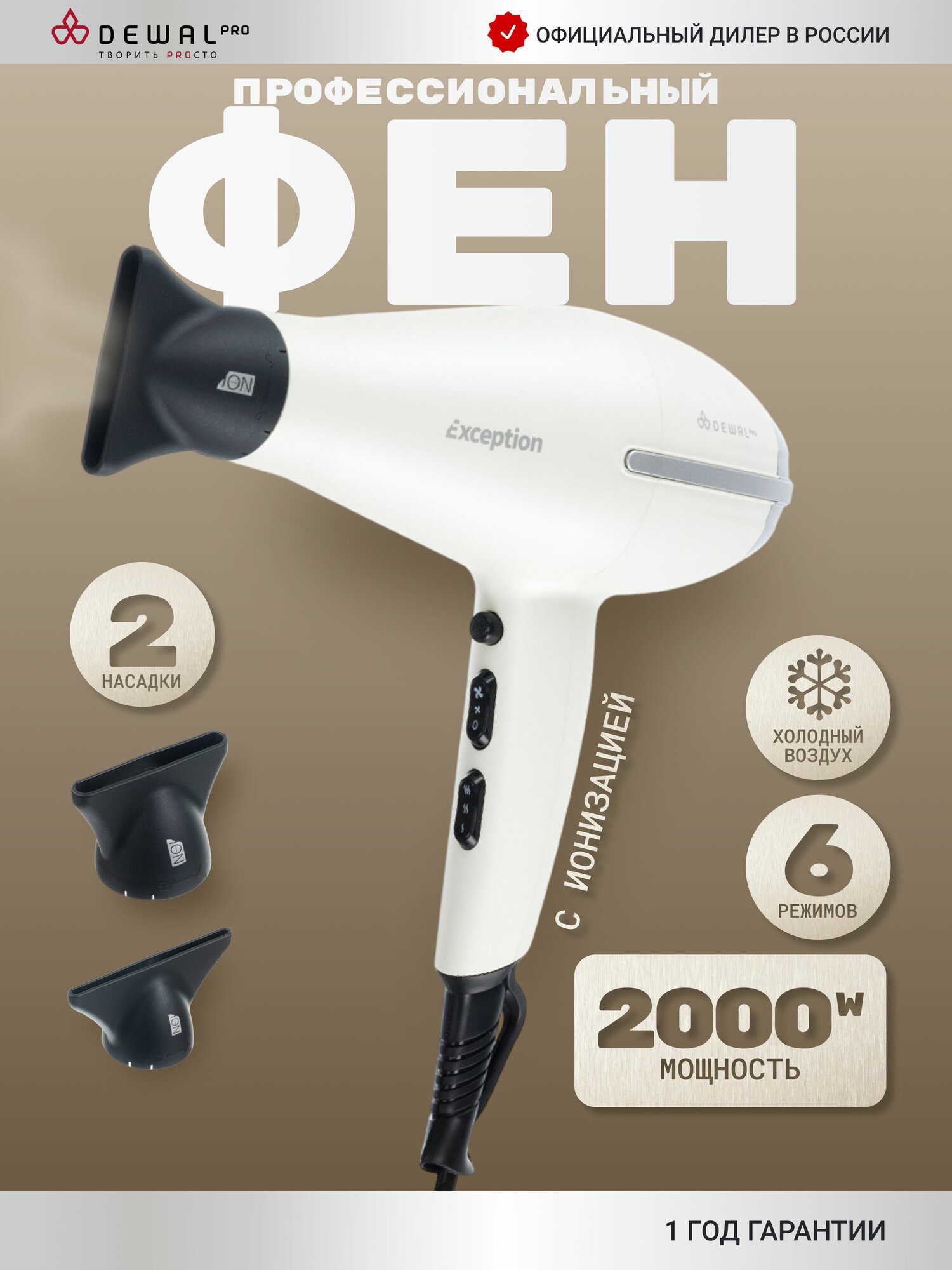 Купить Фен для волос профессиональный DEWAL Pro серия EXCEPTION White, ионизация, мощность 2200 Вт, 2 насадки, провод 3 м, белый с доставкой по всей России.