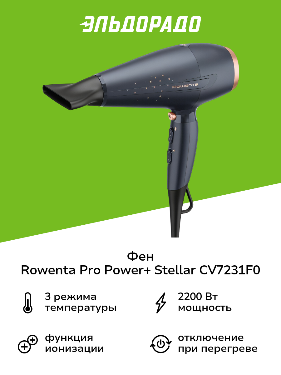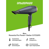 Купить Фен для волос Rowenta Pro Power+ Stellar CV7231F0, 2200 Вт, серый, с ионизацией и 3 насадками с доставкой по всей России.