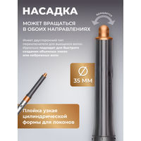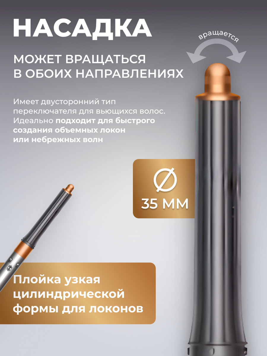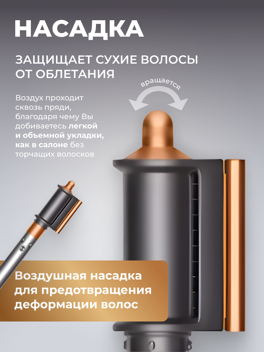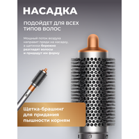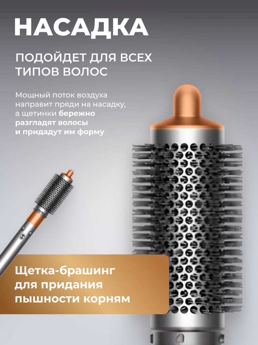 Ваши локоны мягко притягиваются к поверхности длинной насадки, даже если она цилиндрической формы. Воздух проходит сквозь пряди, благодаря чему вы добиваетесь легкой и объемной укладки, как в салоне.