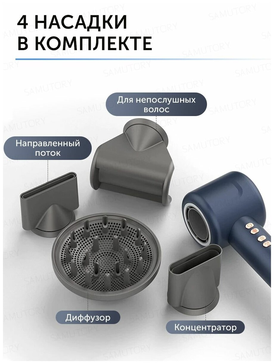 Благодаря мощному потоку воздуха, высушить волосы теперь не отнимет много времени. Инновационная конструкция фена находится не в корпусе, а в ручке. Это позволяет перераспределить и усилить поток воздуха до скорости 41 л/сек. Фен для волос с насадками поможет подобрать настройки для своего типа волос. Вы можете выбрать одну из трёх скоростей, а температура варьируется от 28 до 100 градусов. Плюс, есть функция ионизации, которая убирает статику, и волосы не пушатся. В комплекте поставляются магнитные насадки для придания объема прическе, создания небрежных локонов и получения узкого или объемного воздушного потока. Кнопочная панель управления позволяет подобрать параметры нагрева и скорости обдува, подходящие типу прядей и способу укладки. Мотор расположен в рукояти устройства, что способствует наиболее комфортной эксплуатации. Фен профессиональный для волос имеет более широкий и зауженный профиль насадки-концентратора новой конструкции создает высокоскоростной концентрированный поток воздуха, который идеально подходит для укладки. Благодаря концентрированному потоку воздуха вы можете формировать каждый локон по отдельности, не затрагивая другие пряди. Усовершенствованная конструкция фена диффузора обеспечивает более равномерное распределение воздуха вокруг локонов, имитируя процесс естественного высушивания. Позволяет снизить пушение и добиться более очерченных завитков и локонов. Удлиненные зубцы, тем самым фен для волос профессиональный позволяют уложить более крупные пряди, обеспечивая максимальный контроль за счет глубокого проникновения в волосы. Насадка для бережного высушивания, созданная для тонких волос и чувствительной кожи головы, рассеивает воздух, создавая более мягкий и прохладный поток, при этом быстро высушивая волосы.