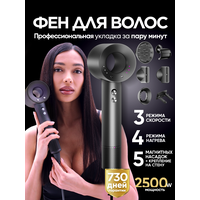 Профессиональный фен - мощный прибор быстро высушивает, придает объем, создает красивую укладку. Комплект из 5 насадок, 4 уровня нагрева, 3 скорости! Нагрев до 100 градусов быстро высушивает мокрые волосы, 80 градусов (стандартный уход), 60 градусов (бережная сушка теплым воздухом), 28 градусов (обдув холодным воздухом). Набор сменных магнитных насадок: круглая насадка (бережное высушивание), диффузор, насадка для направленного воздушного потока с широким соплом, для непослушных волос и концентратор с узким соплом. У модели длинный шнур (кабель - провод) - можно использовать компактный прибор с комфортом, с полной свободой движений, даже если электрическая розетка далеко. Переключатели функций управляются удобными кнопками на корпусе фена. Плюсы: функции ионизации, защита от перегрева, фен с диффузором для кудрей сушит и ухаживает за волосами, защищает от повреждения прядей и воздействия высоких температур. Универсальный электронный прибор мощностью 2500 Вт удобно использовать дома, как дорожный фен и в путешествиях. Бытовая техника удобной формы подходит для всех типов волос и кожи головы: нормальных, сухих, жирных, вьющихся, кудрявых, прямых, волнистых, пушистых, тонких, коротких, длинных, локонов средней длины, любой густоты. Бесшумный портативный прибор с несколькими насадками для разных типов волос и для укладки объемной челки подойдет для взрослых женщин, мужчин, парней, девушек, девочек, мальчиков, подростков. Профессиональный ручной маленький фен для ухода в домашних условиях! Многофункциональный фен стайлер с регулировкой температуры высушивания для красоты и здоровья волос удобно держать в руках, он легкий и тихий. Фен упакован в большую картонную коробку. Перед отправкой проходит проверку на работоспособность.