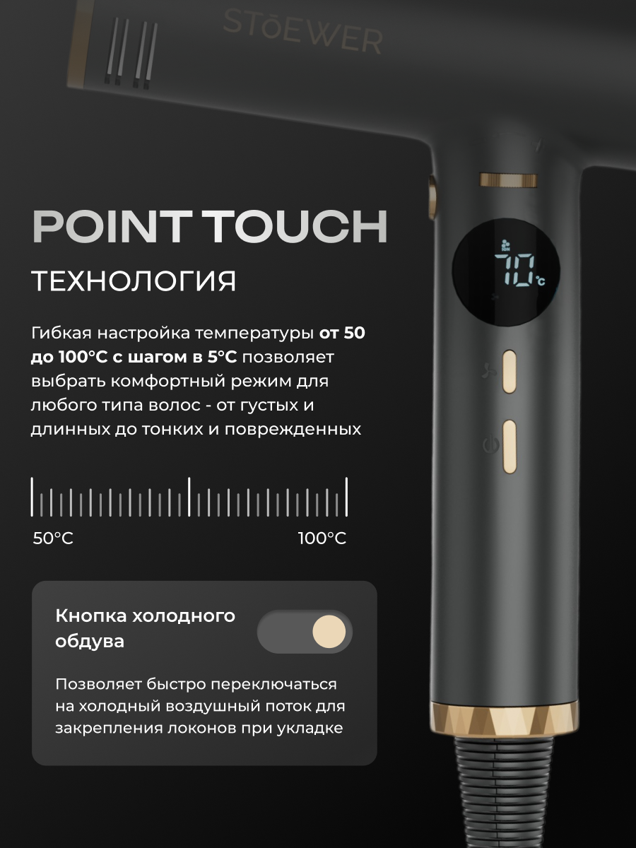 Фен для волос STOEWER Hair Bliss Pro — это профессиональный прибор с мощностью 1300 Вт и максимальной температурой нагрева до 100°C. В комплекте идут три насадки, включая диффузор и концентратор, что делает его универсальным для различных типов укладки. Он поддерживает 12 температурных режимов, функцию ионизации и подачу холодного воздуха, обеспечивая бережный уход за волосами. Фен оснащен независимой системой управления, дисплеем, защитой от перегрева и компактным дизайном, что упрощает его использование и хранение. Предназначен для профессионального применения.