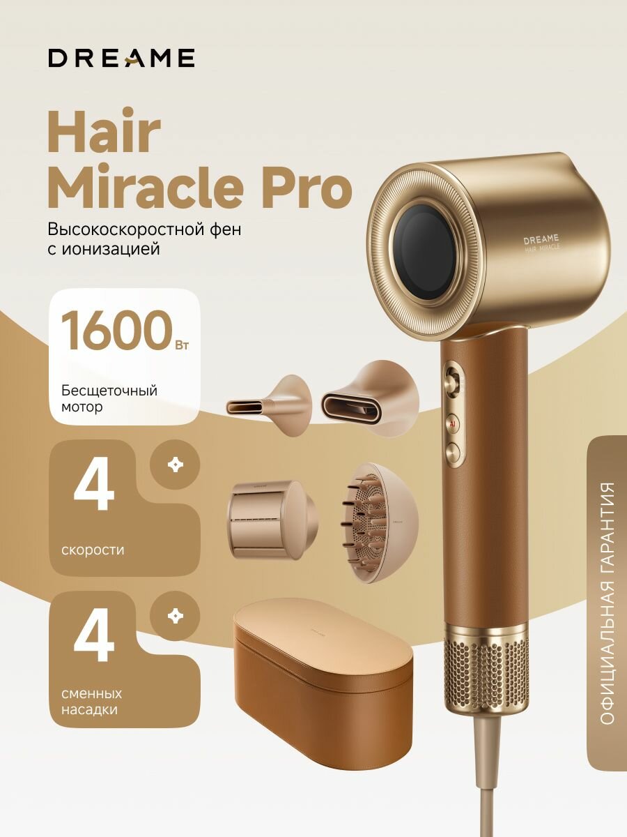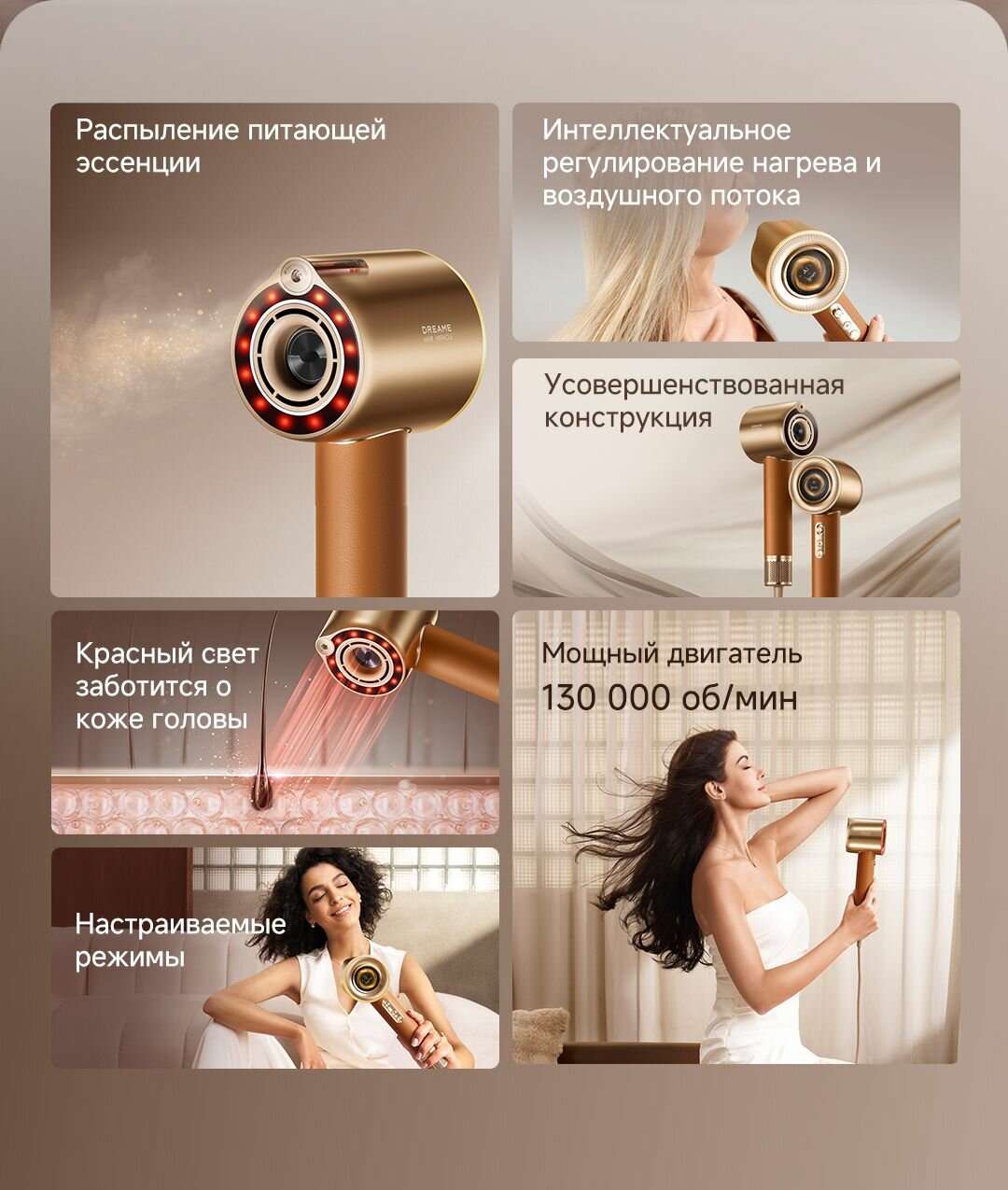 Купить Фен Dreame Miracle Pro 1600 Вт, 130000 об/мин, 6 режимов, 2 скорости, 4 магнитные насадки, двойная красная подсветка, функция ионизации, система NTC и технология распыления с доставкой по всей России.